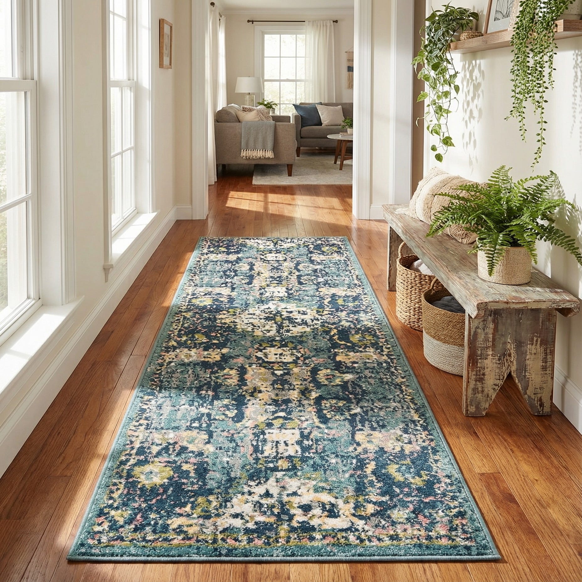 Primary color is Navy Blue. Colors in this rug include: Navy Blue, Blue, Gray, Green, Ivory, Puce, Yellow.