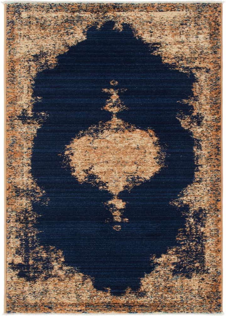 Primary color is Navy Blue. Colors in this rug include: Navy Blue, Blue, Cream, Ivory, Orange.