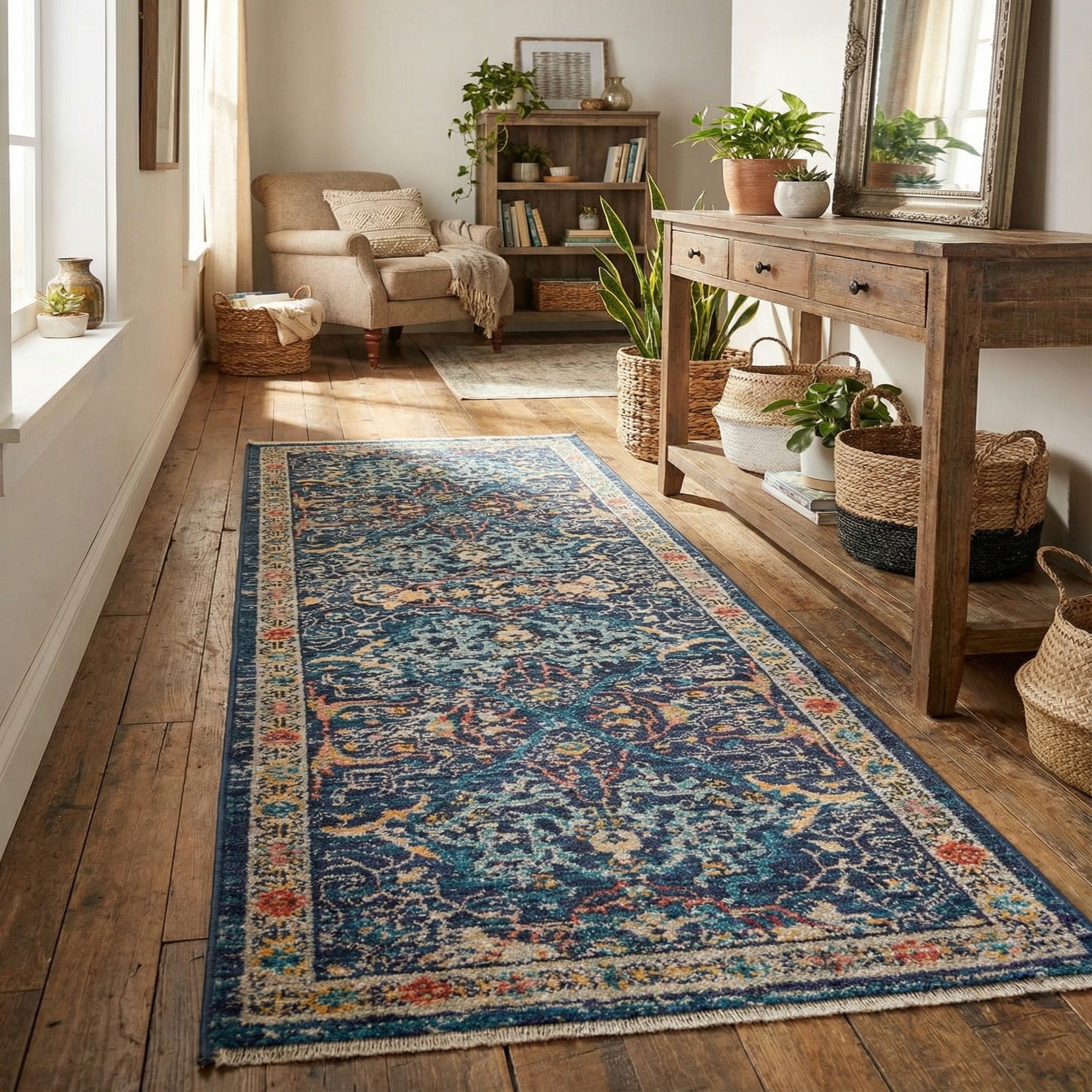 Primary color is Navy Blue. Colors in this rug include: Navy Blue, Brown, Light Blue, Orange, Red, Yellow, Ivory.