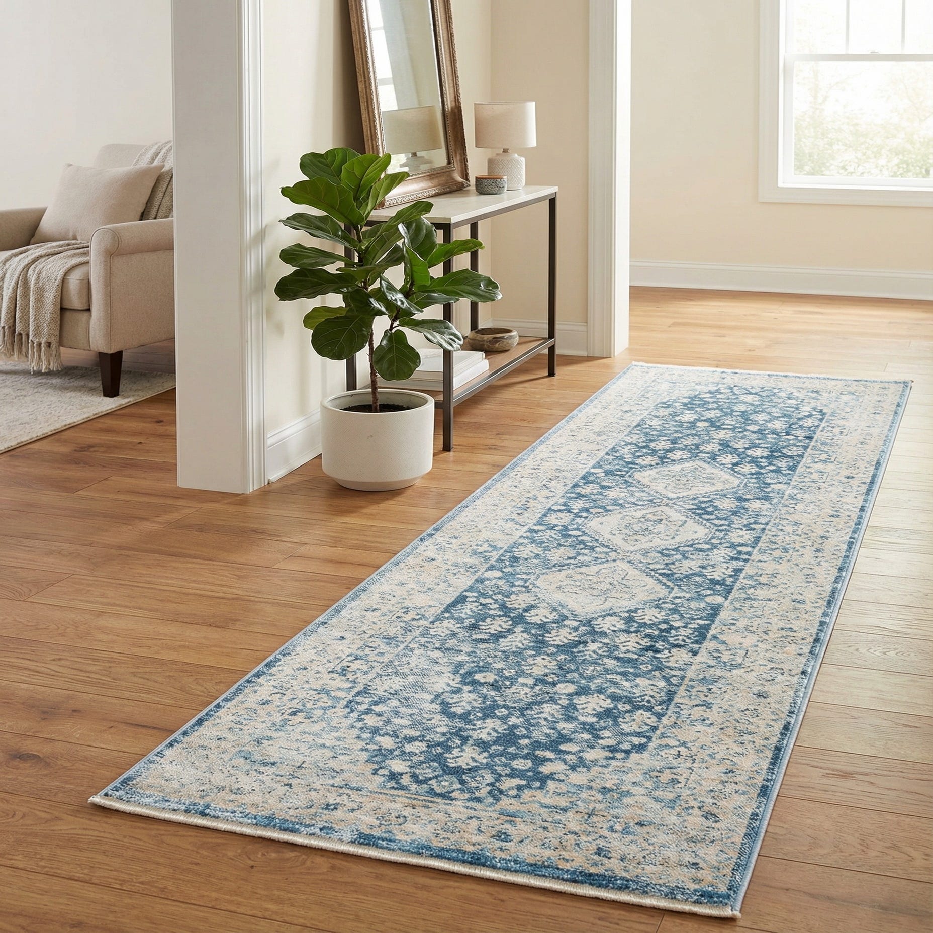 Primary color is Navy Blue. Colors in this rug include: Navy Blue, Ivory, Light Blue.