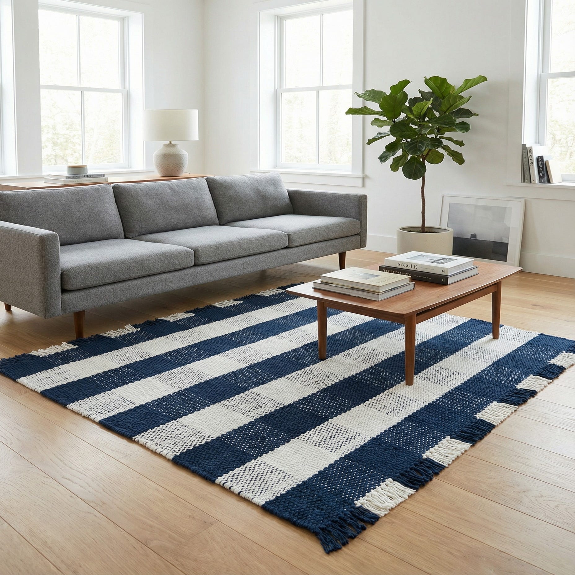 Primary color is Navy Blue. Colors in this rug include: Navy Blue, Ivory.