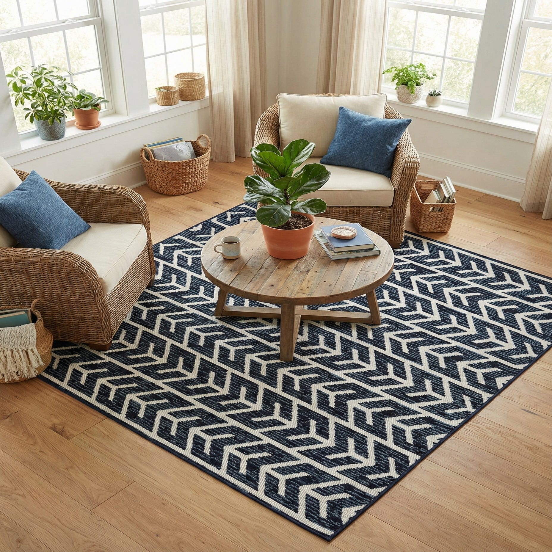 Primary color is Navy Blue. Colors in this rug include: Navy Blue, Ivory, Light Blue.