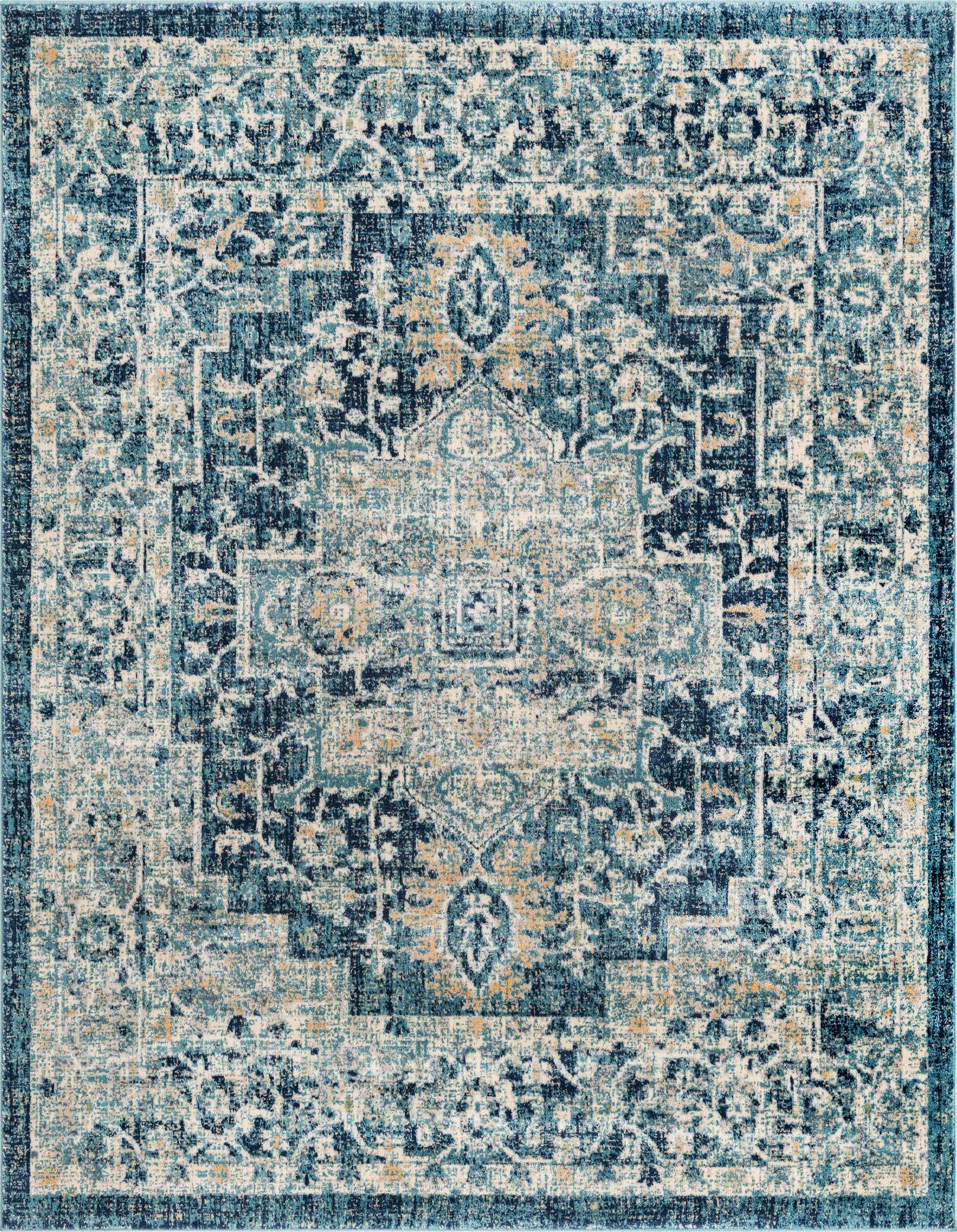 Primary color is Navy Blue. Colors in this rug include: Navy Blue, Blue, Gray, Ivory, Light Green, Tan.