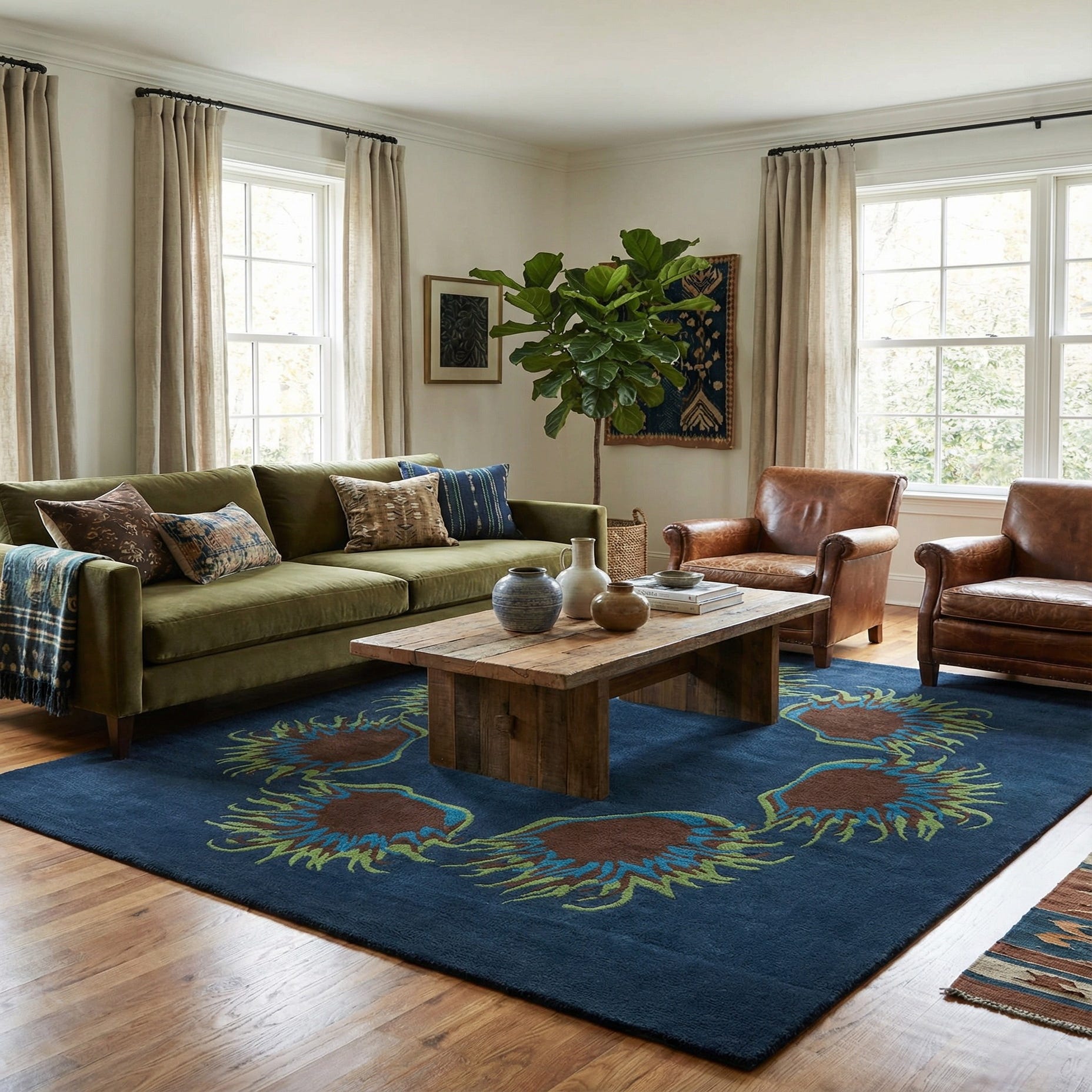 Primary color is Navy Blue. Colors in this rug include: Navy Blue, Blue, Brown, Green.