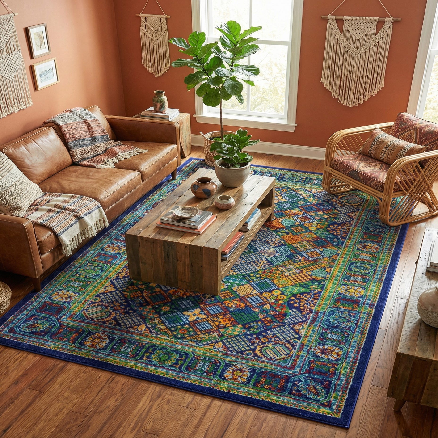 Primary color is Navy Blue. Colors in this rug include: Navy Blue, Blue, Green, Ivory, Light Blue, Red, Yellow, Orange.