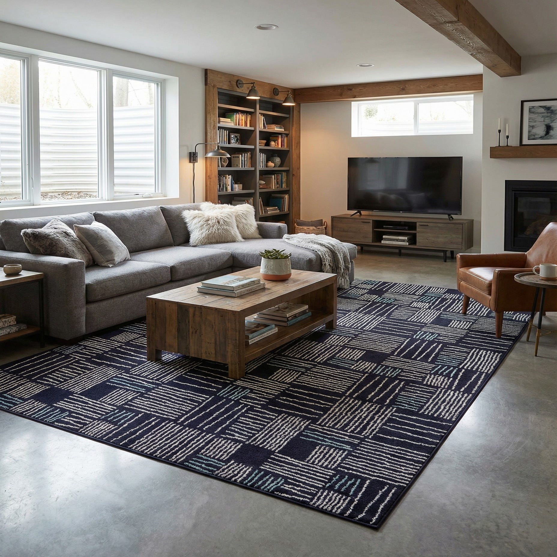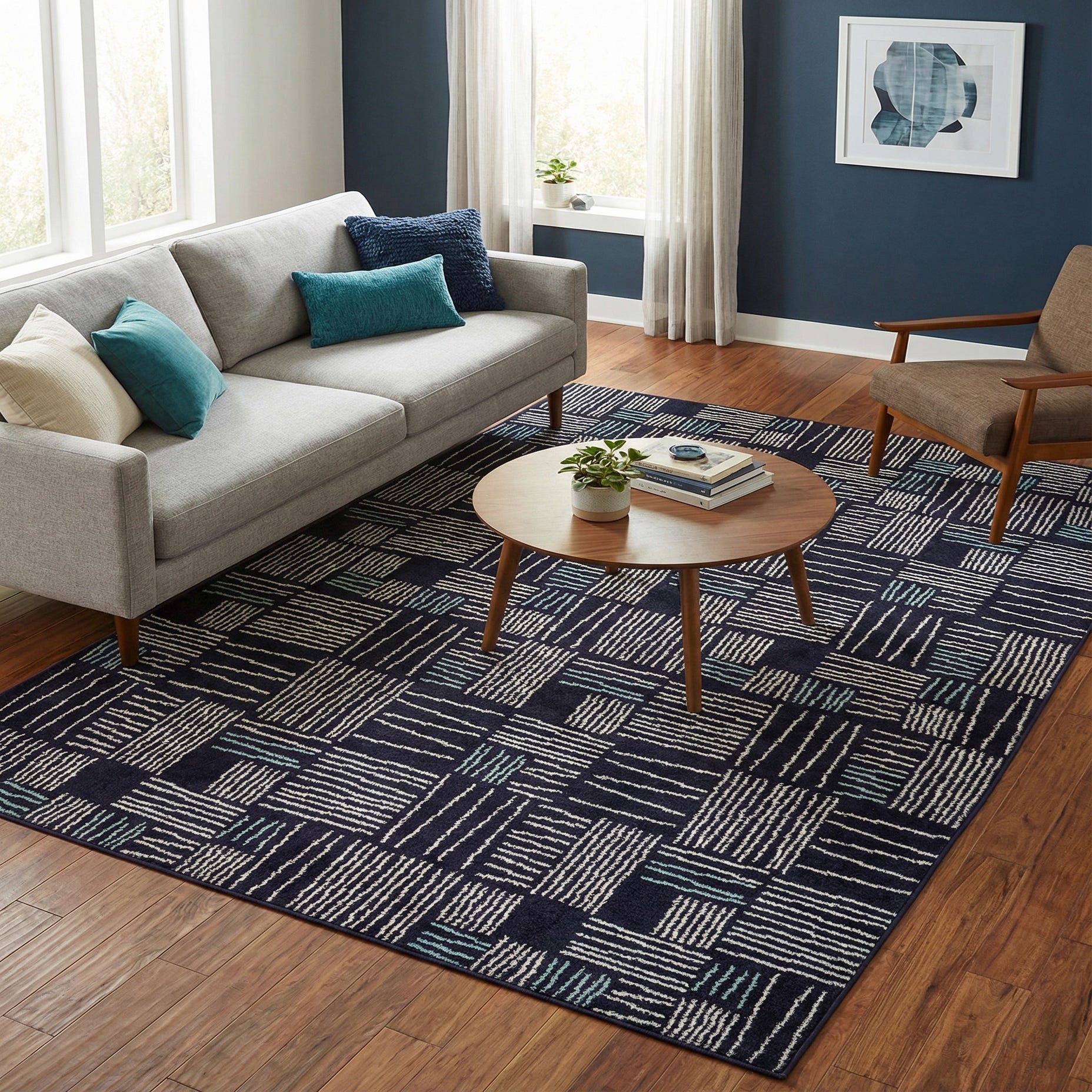 Primary color is Navy Blue. Colors in this rug include: Navy Blue, Ivory, Light Blue.
