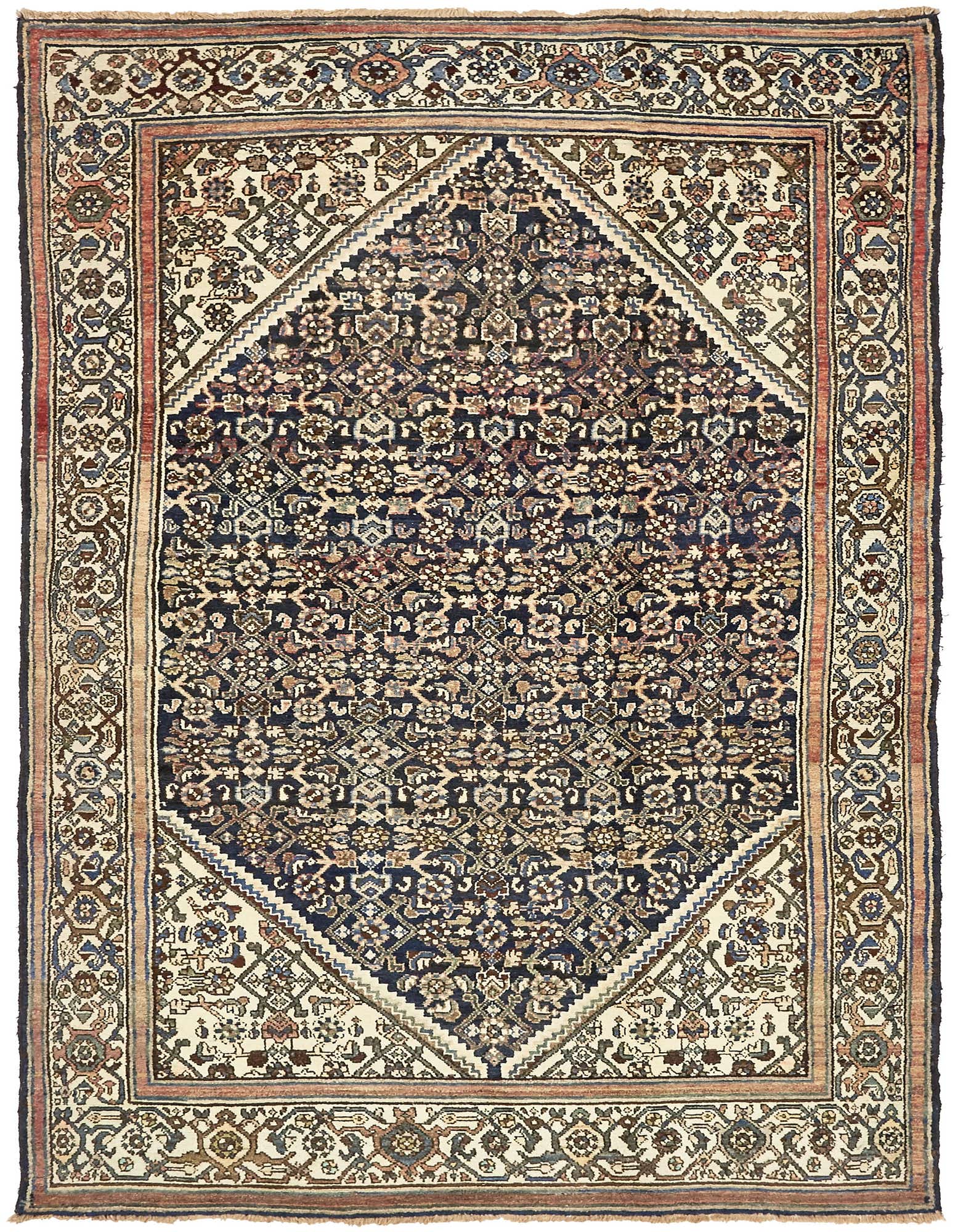 Primary color is Navy Blue. Colors in this rug include: Navy Blue, Cream, Peach, Blue, Green, Olive, Brown.