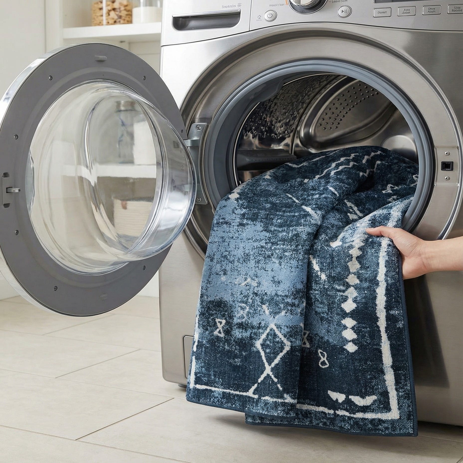 Primary color is Navy Blue. Colors in this rug include: Navy Blue, Gray, Ivory, Light Blue.