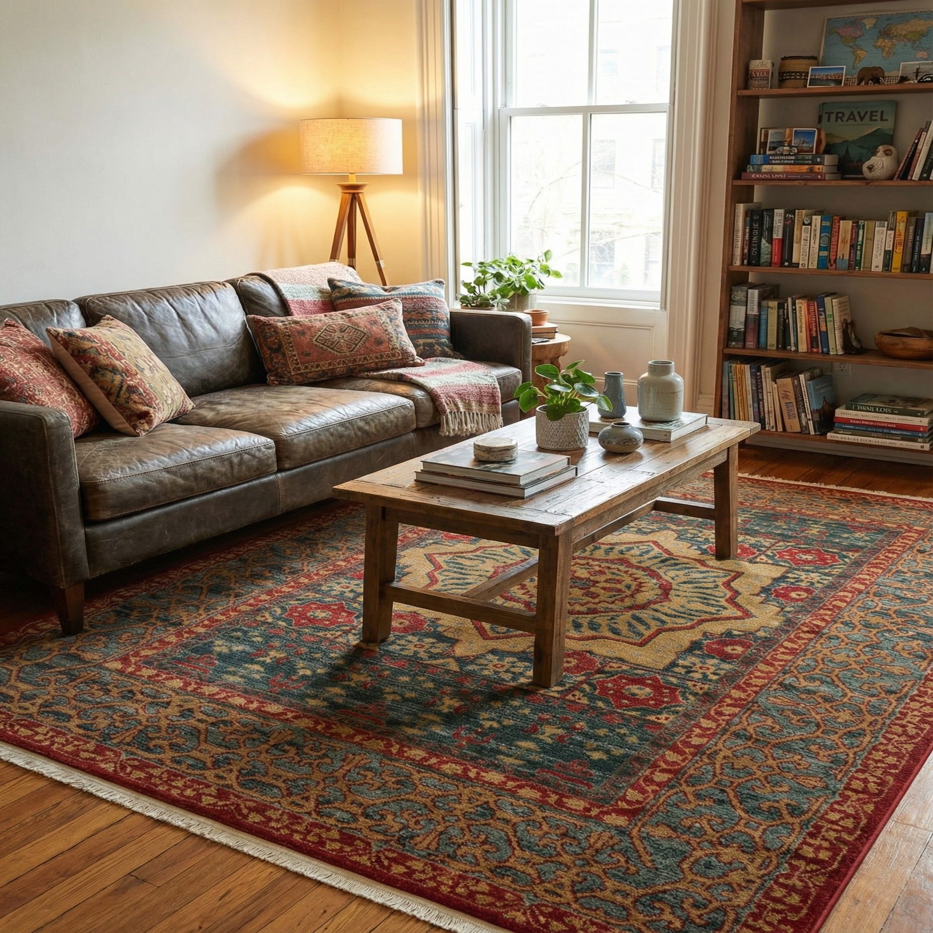 Primary color is Navy Blue. Colors in this rug include: Navy Blue, Red, Light Blue, Light Brown, Light Green.