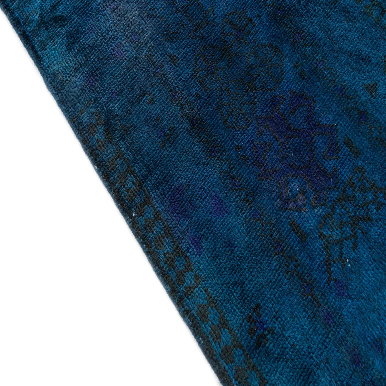 Primary color is Navy Blue. Colors in this rug include: Navy Blue, Black, Purple, Light Blue.