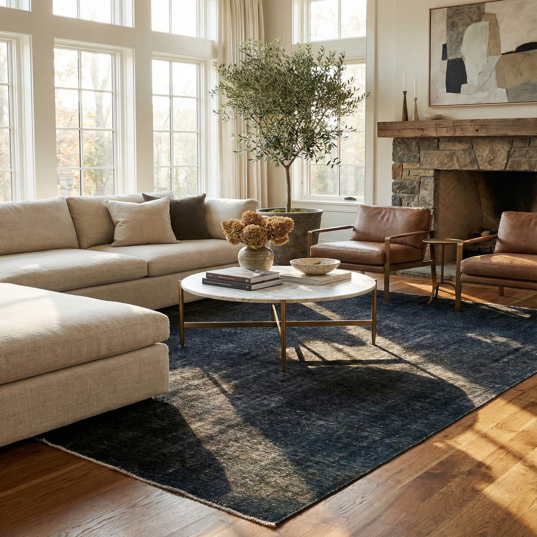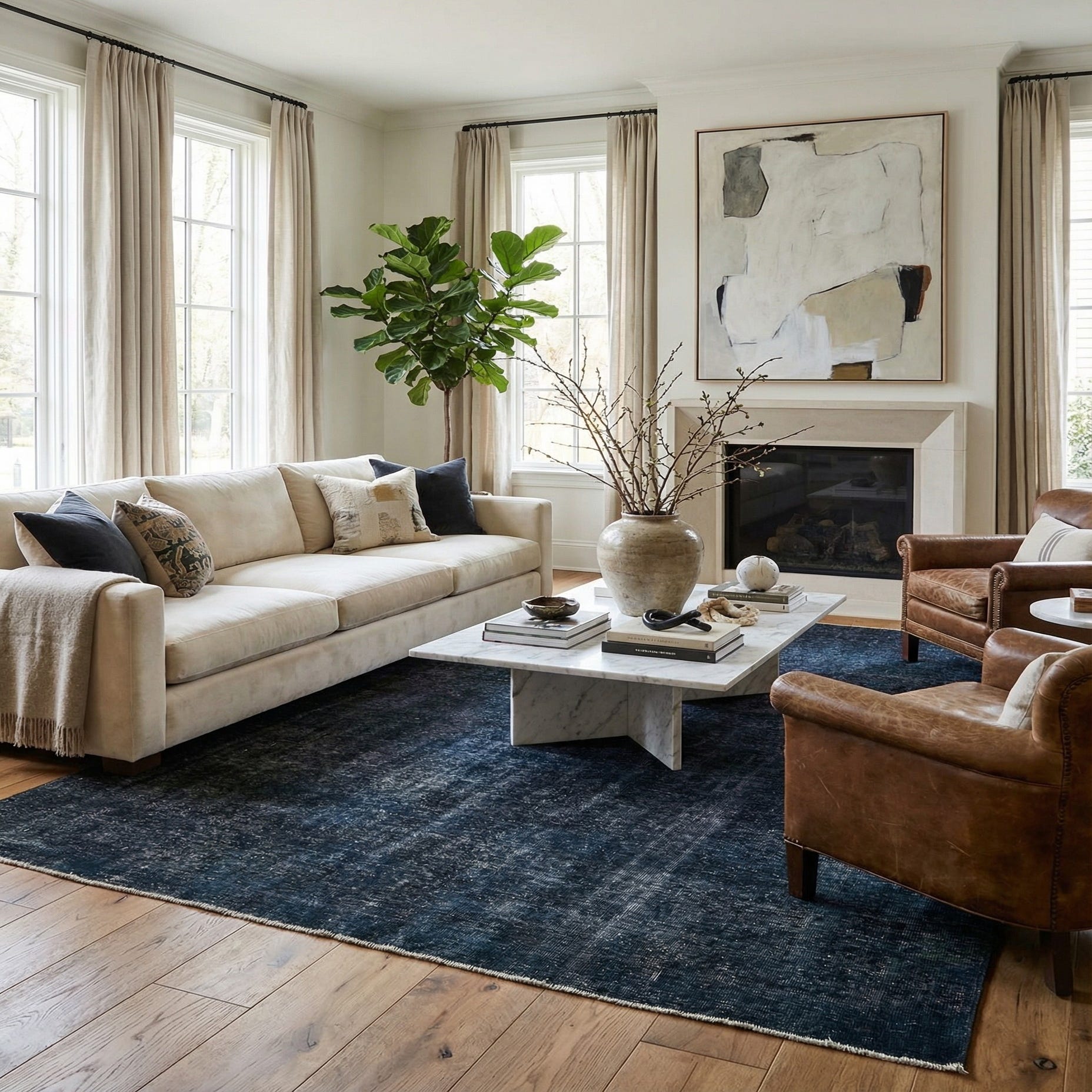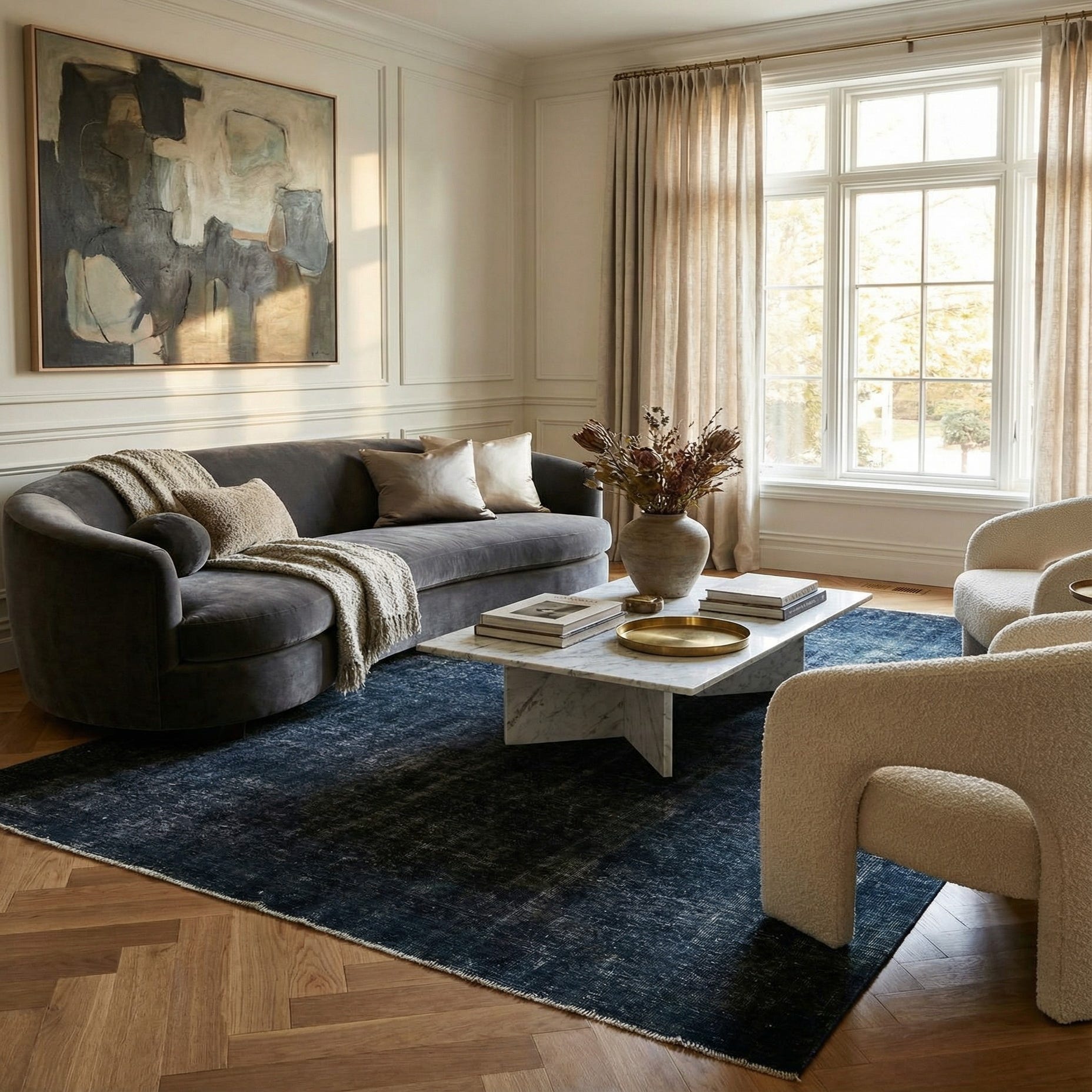 Primary color is Navy Blue. Colors in this rug include: Navy Blue, Ivory.