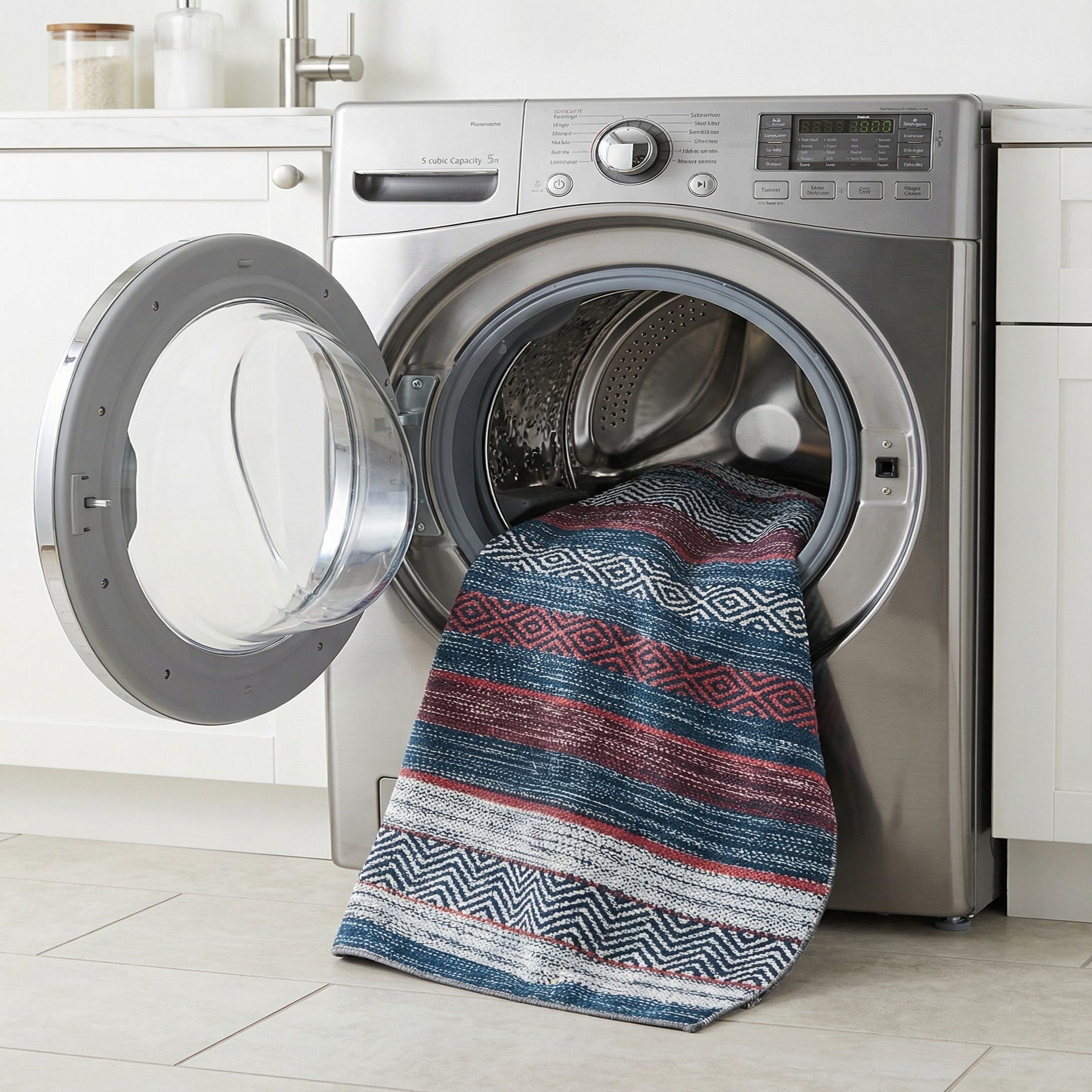 Primary color is Navy Blue. Colors in this rug include: Navy Blue, Blue, Ivory, Light Blue, Red, Pink, Puce.