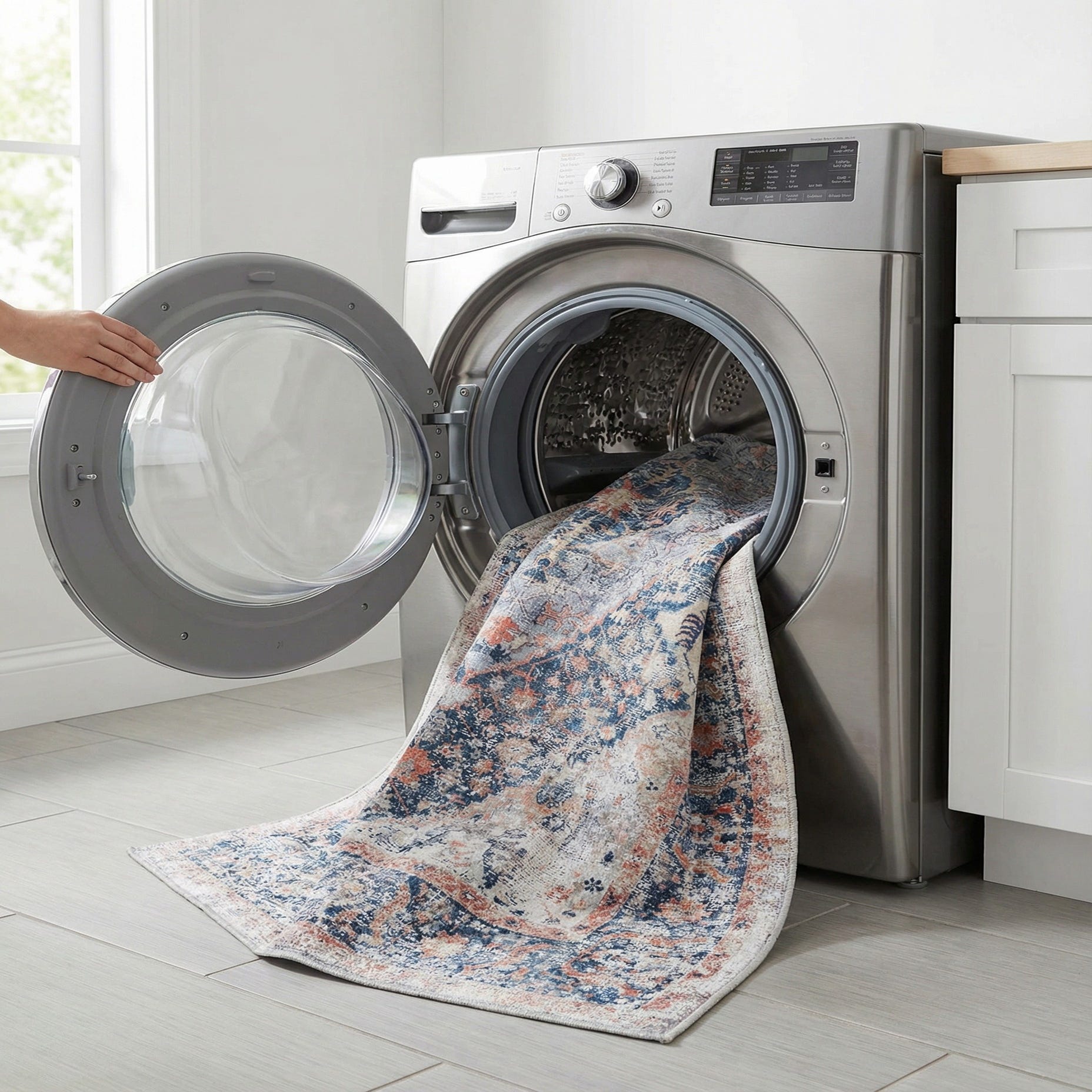 Primary color is Navy Blue. Colors in this rug include: Navy Blue, Blue, Ivory, Pink, Light Blue.