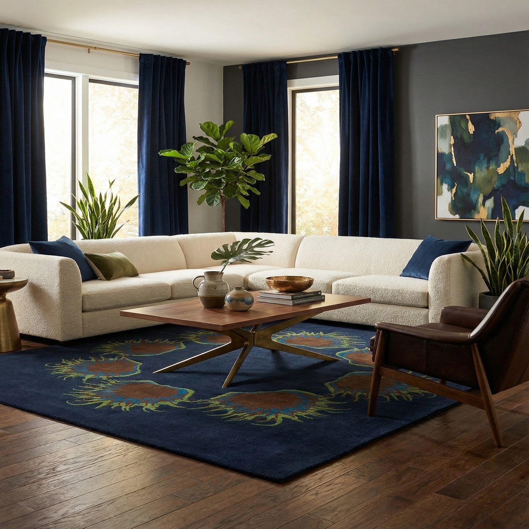 Primary color is Navy Blue. Colors in this rug include: Navy Blue, Blue, Brown, Green.