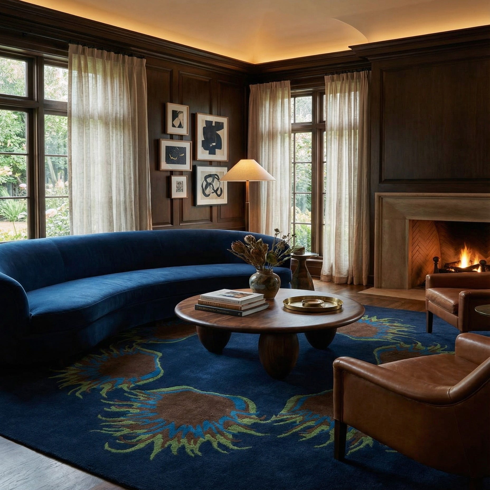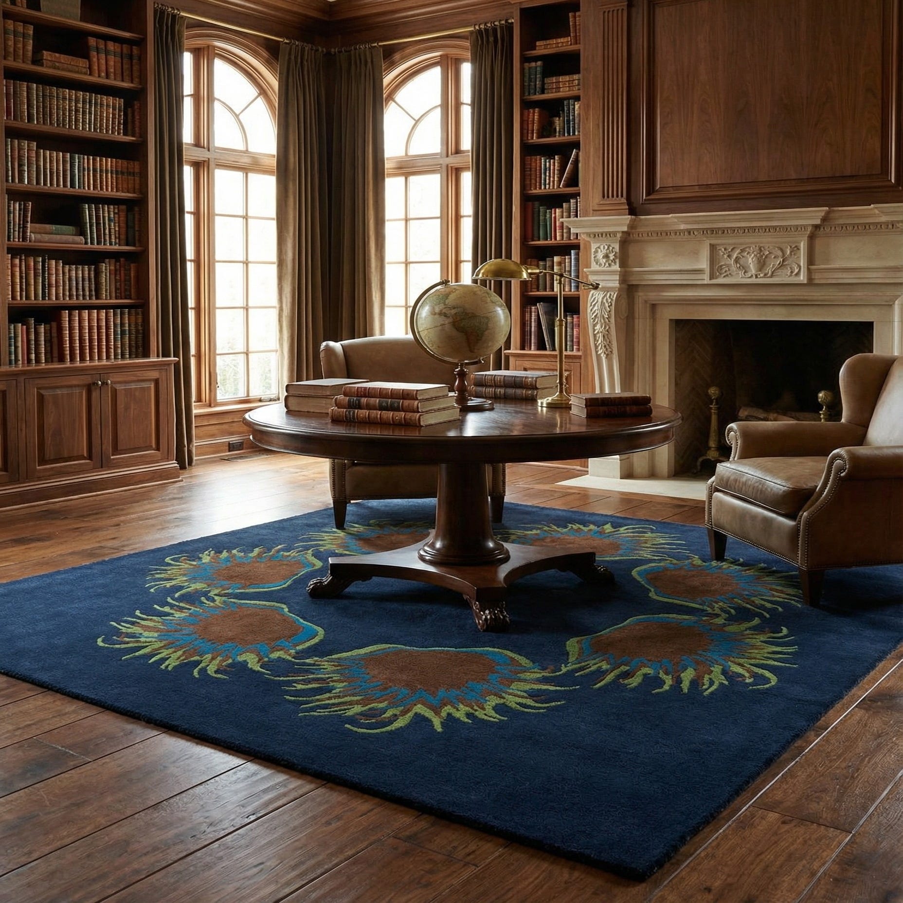Primary color is Navy Blue. Colors in this rug include: Navy Blue, Blue, Brown, Green.