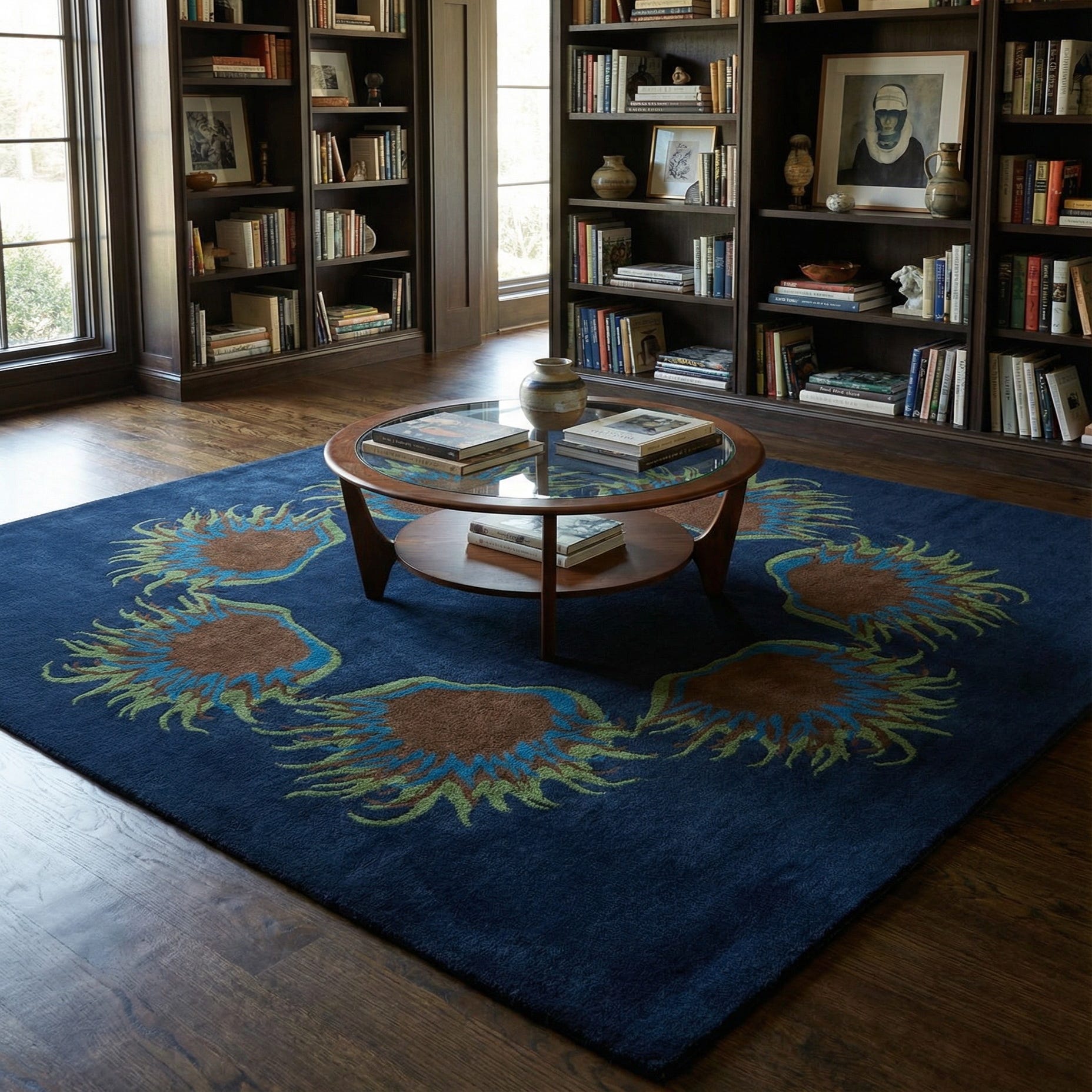 Primary color is Navy Blue. Colors in this rug include: Navy Blue, Blue, Brown, Green.
