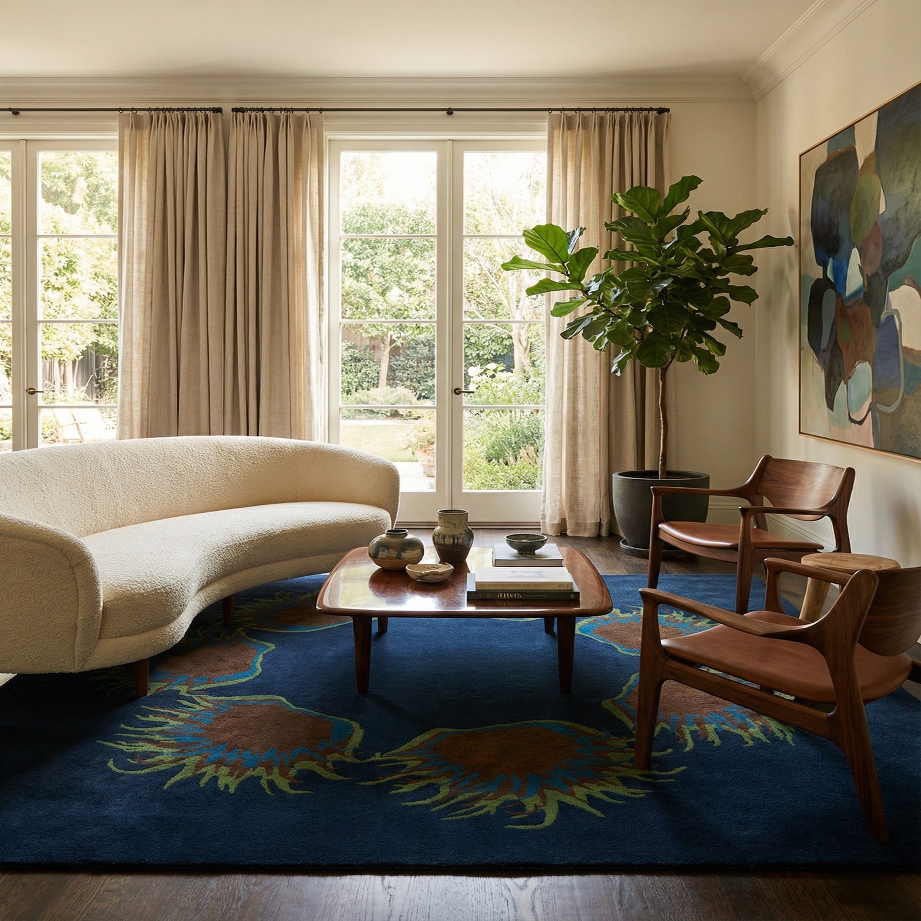 Primary color is Navy Blue. Colors in this rug include: Navy Blue, Blue, Brown, Green.