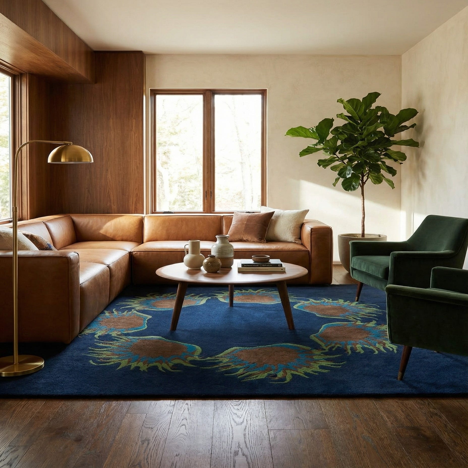 Primary color is Navy Blue. Colors in this rug include: Navy Blue, Blue, Brown, Green.