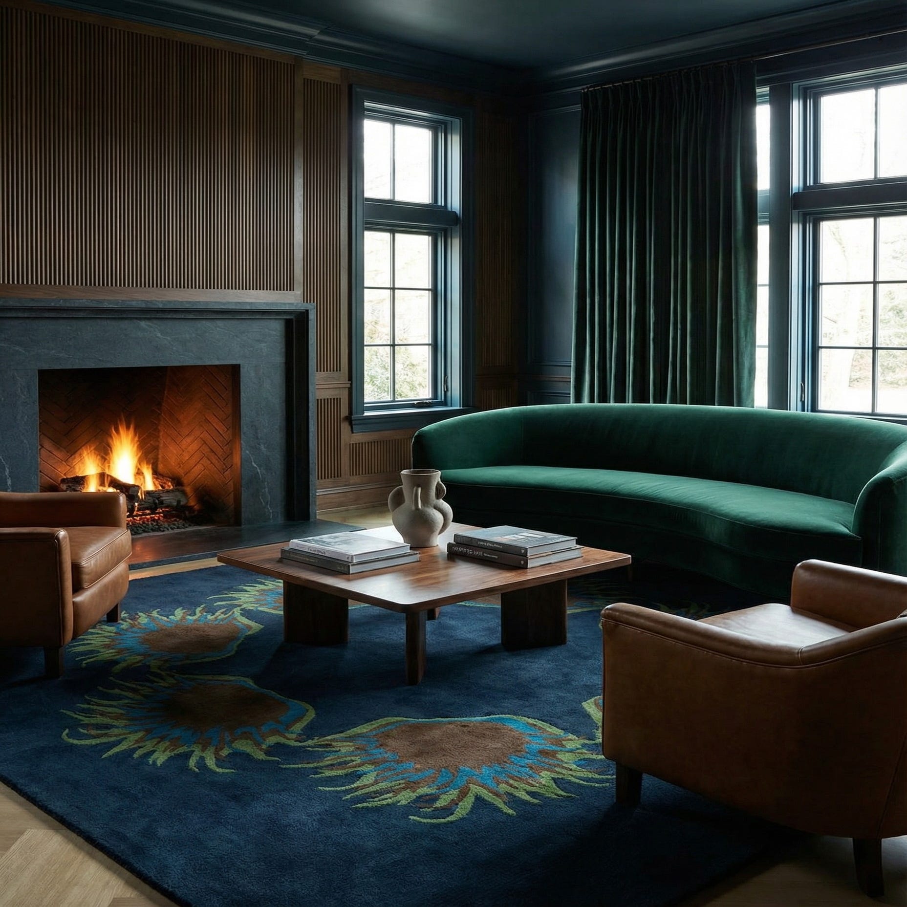 Primary color is Navy Blue. Colors in this rug include: Navy Blue, Blue, Brown, Green.