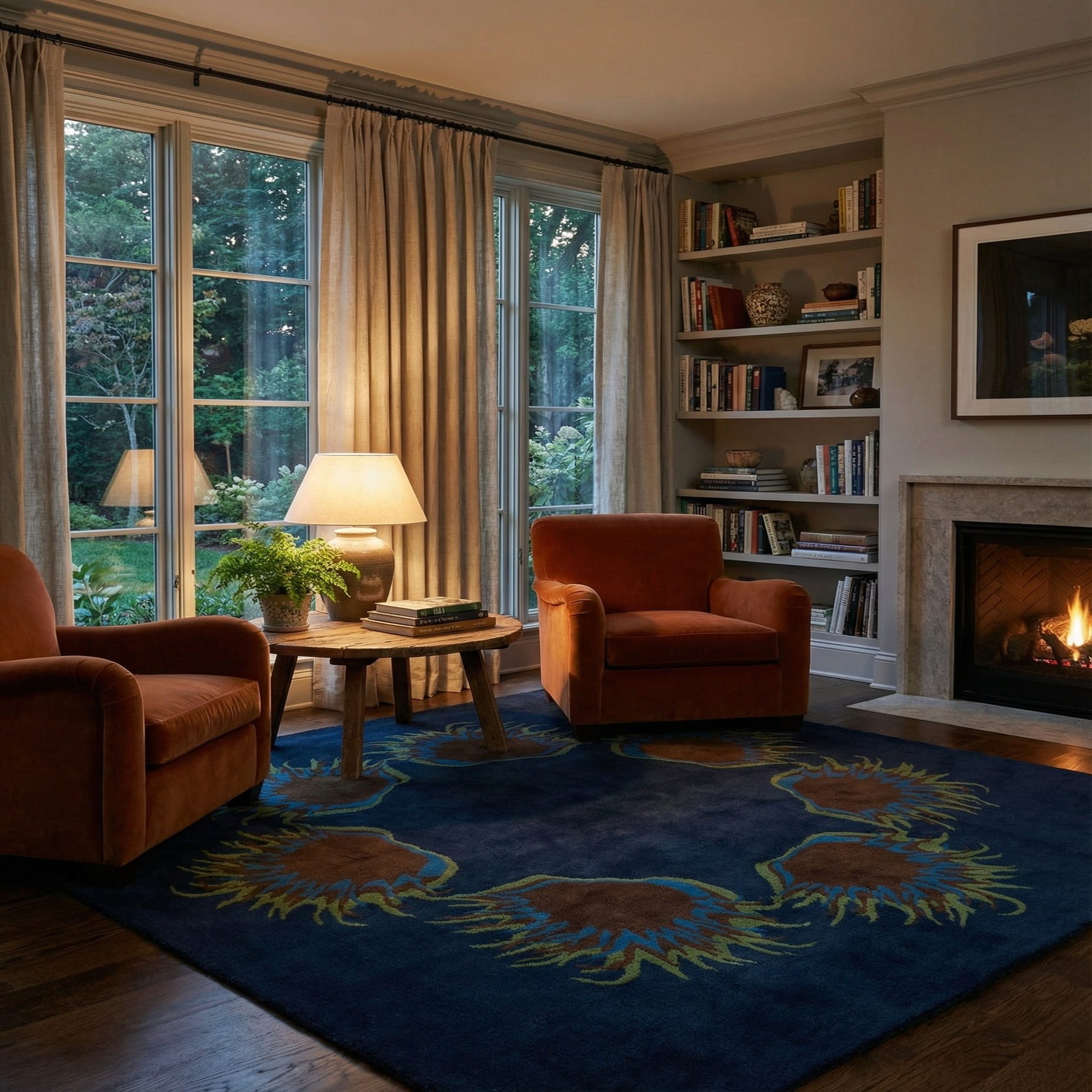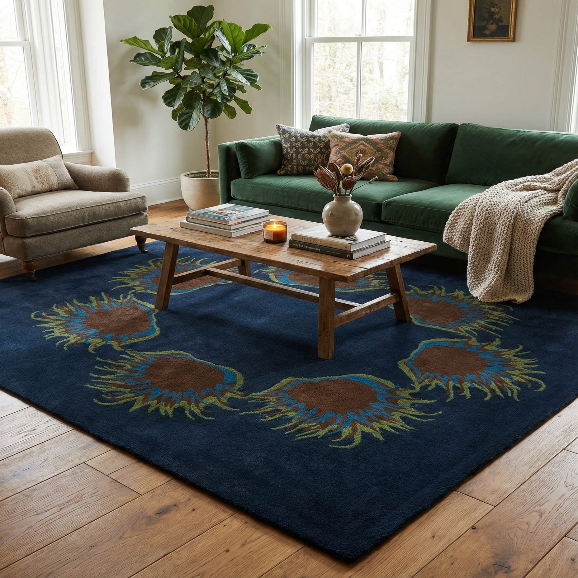 Primary color is Navy Blue. Colors in this rug include: Navy Blue, Blue, Brown, Green.
