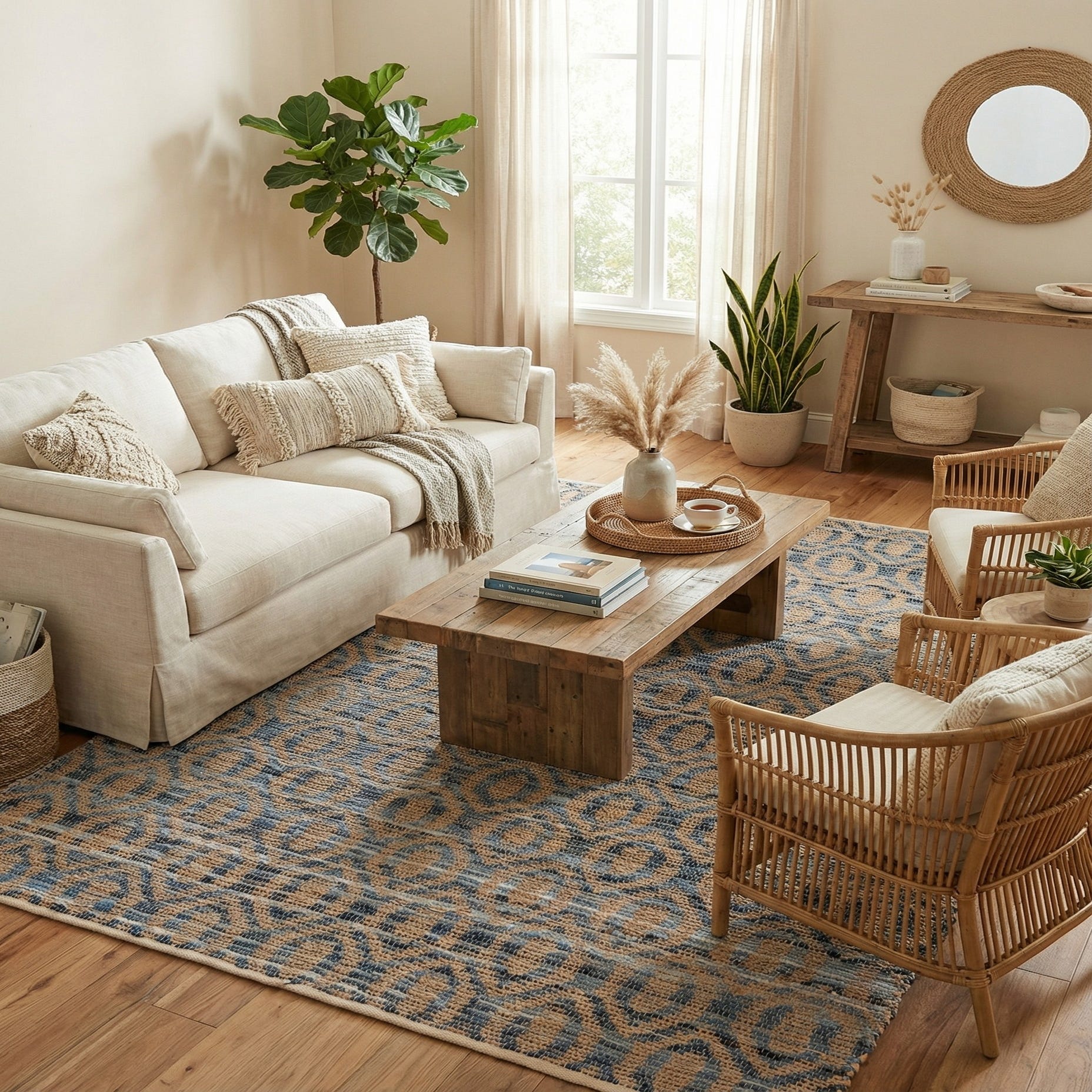 Primary color is Navy Blue. Colors in this rug include: Navy Blue, Natural.