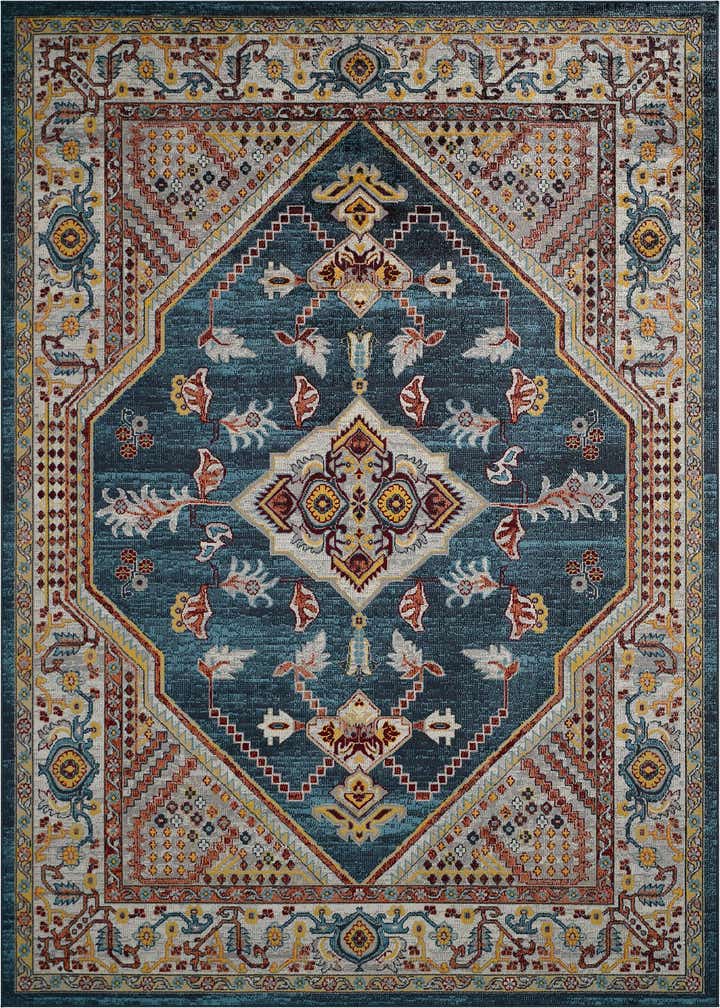 Primary color is Navy Blue. Colors in this rug include: Navy Blue, Beige, Blue, Ivory, Gray, Yellow, Red.