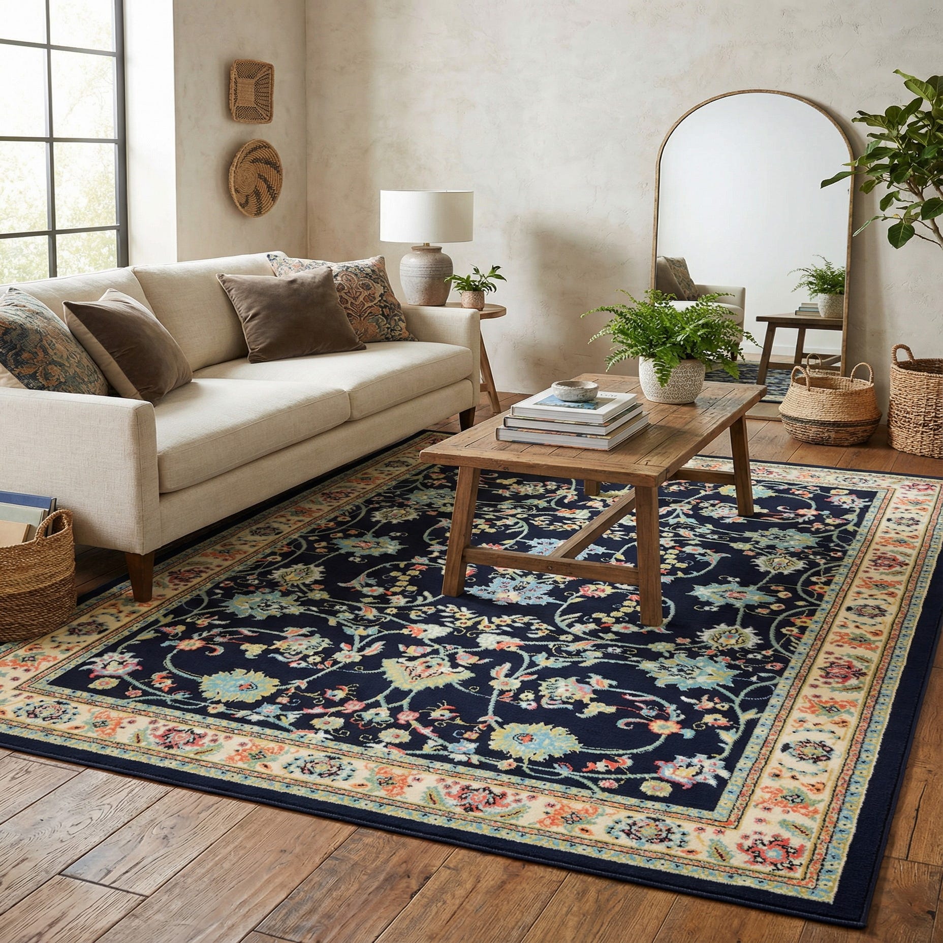 Primary color is Navy Blue. Colors in this rug include: Navy Blue, Cream, Light Blue, Terracotta.