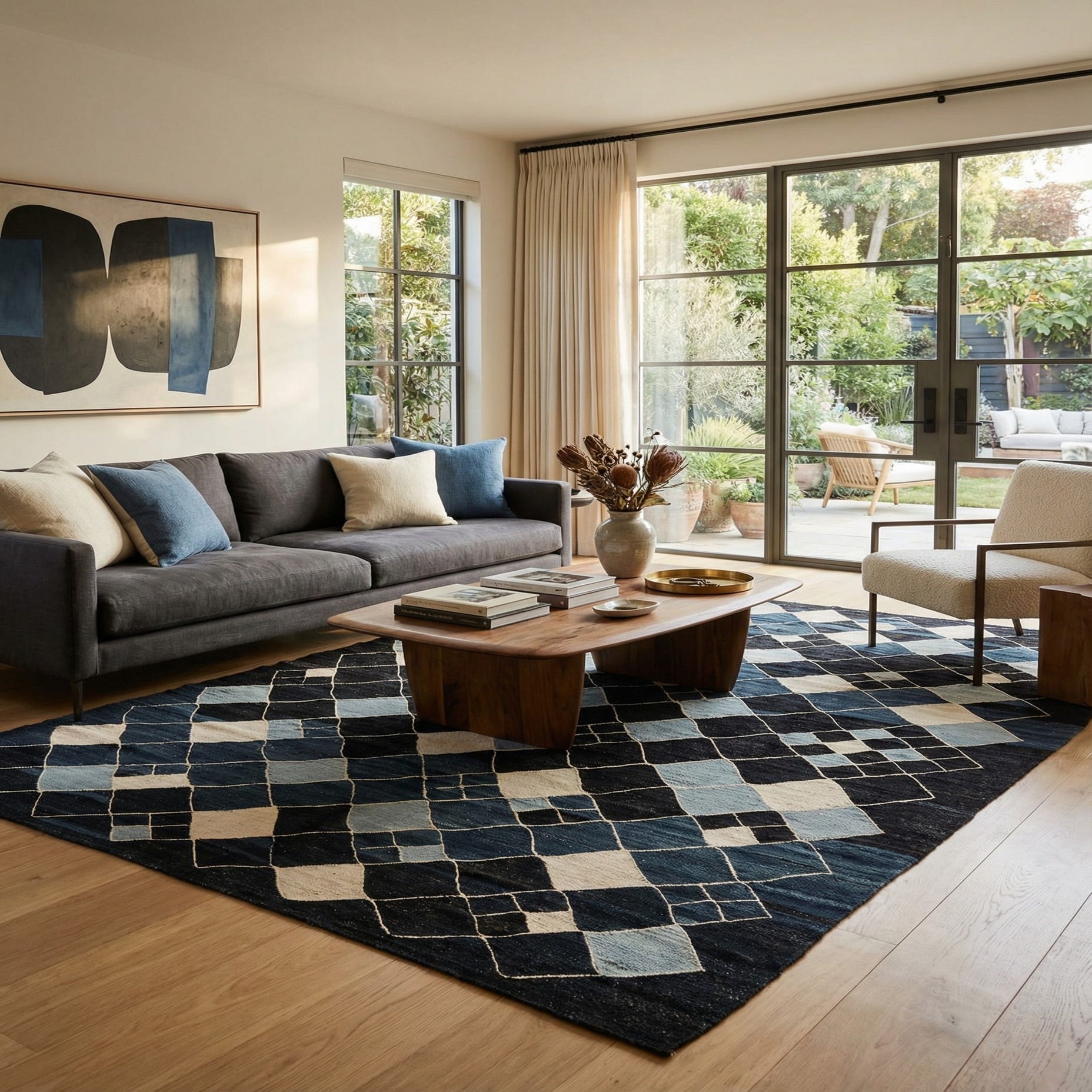 Primary color is Navy Blue. Colors in this rug include: Navy Blue, Black, Ivory, Light Blue.