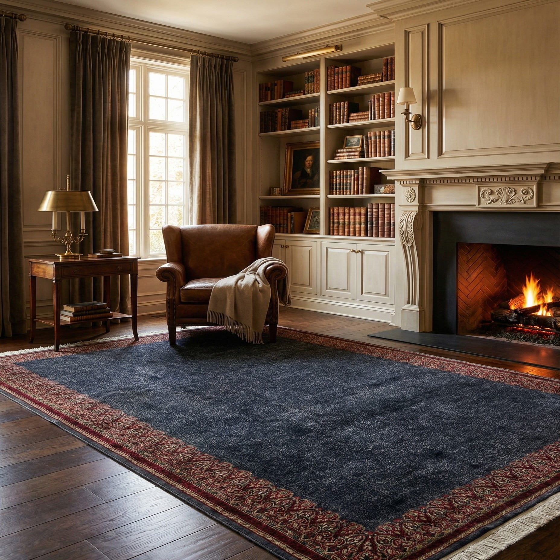 Primary color is Navy Blue. Colors in this rug include: Navy Blue, Beige, Black, Blue, Brown, Red, Pink, Green, Ivory.