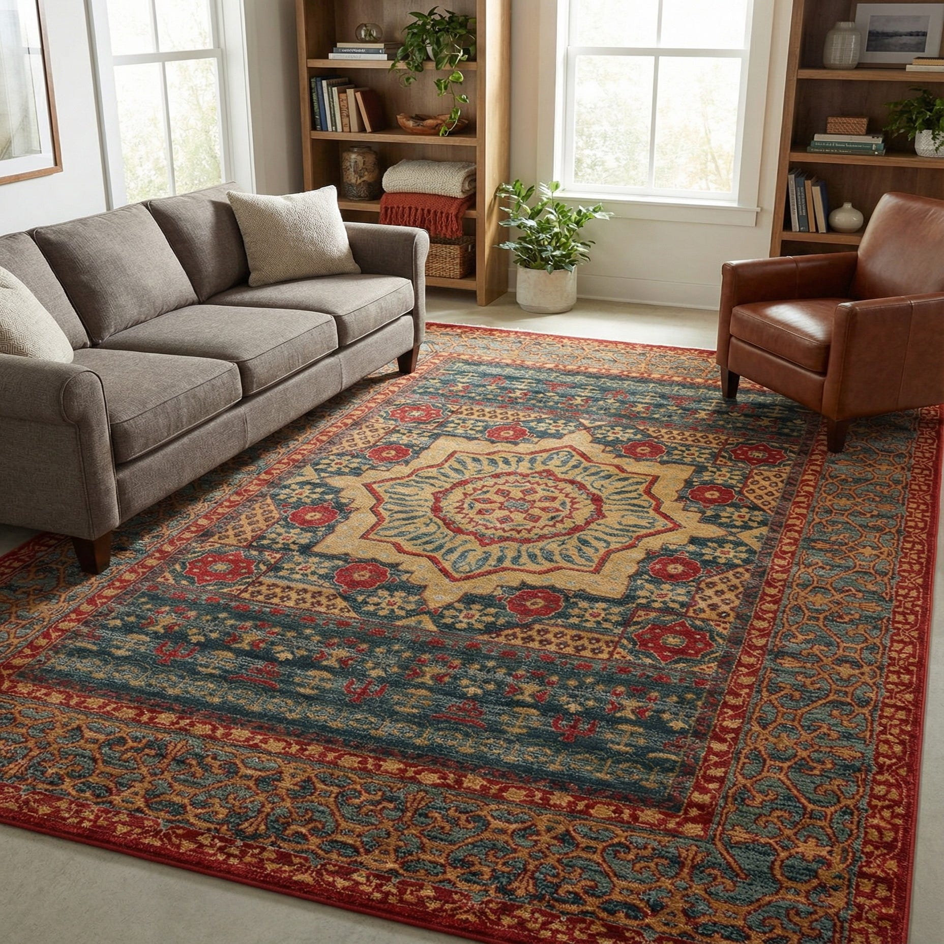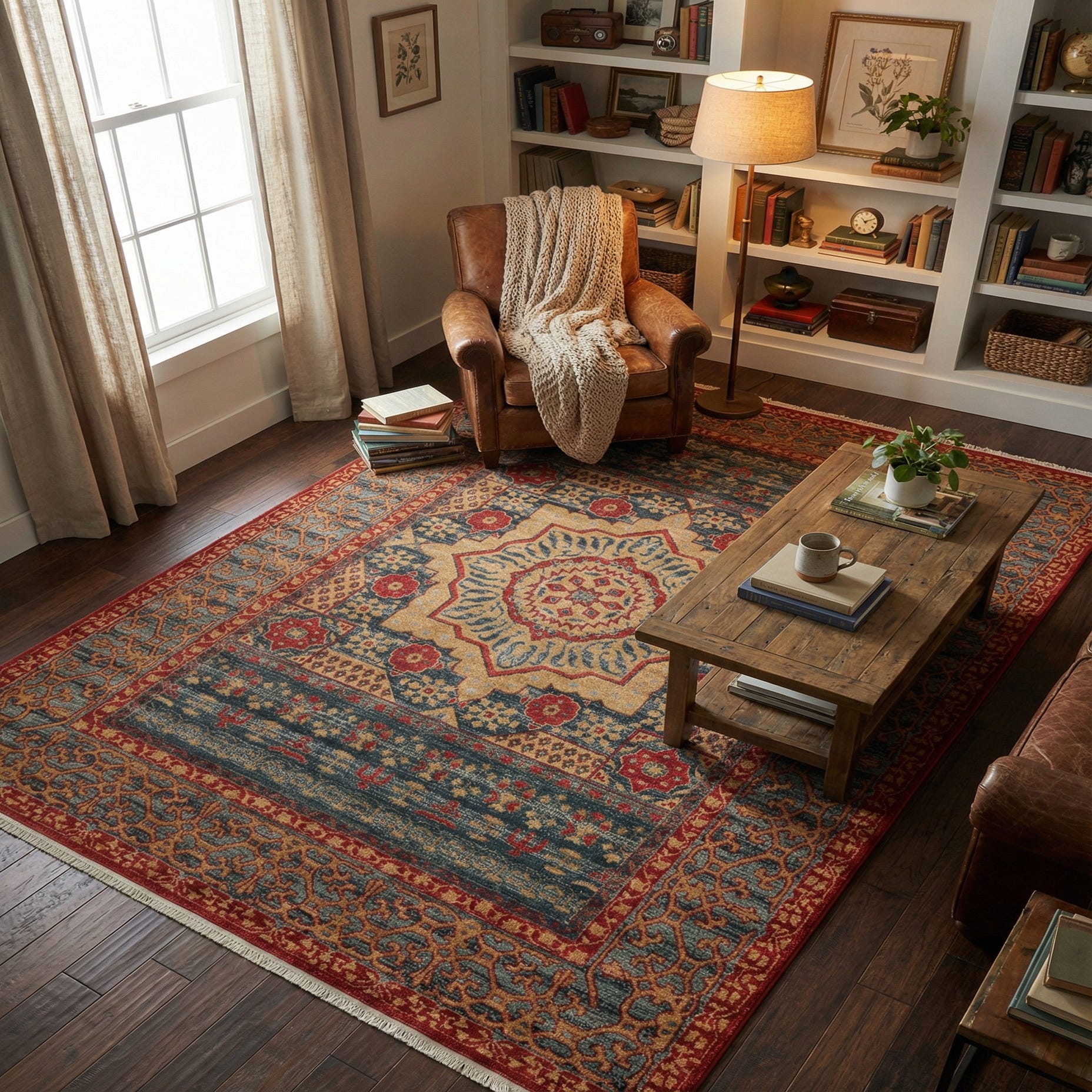Primary color is Navy Blue. Colors in this rug include: Navy Blue, Light Blue, Light Brown, Red.