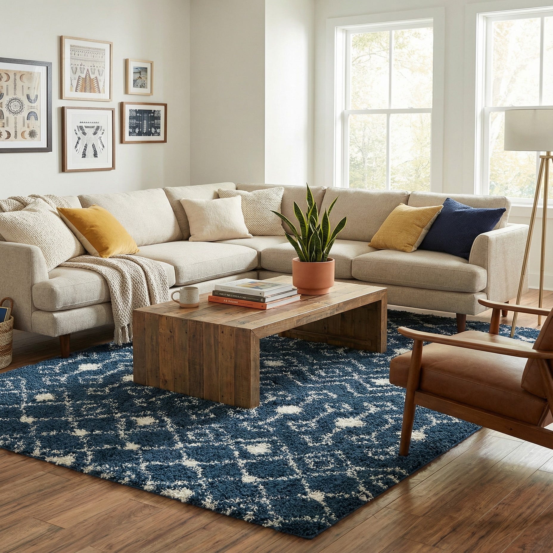 Primary color is Navy Blue. Colors in this rug include: Navy Blue, Ivory.