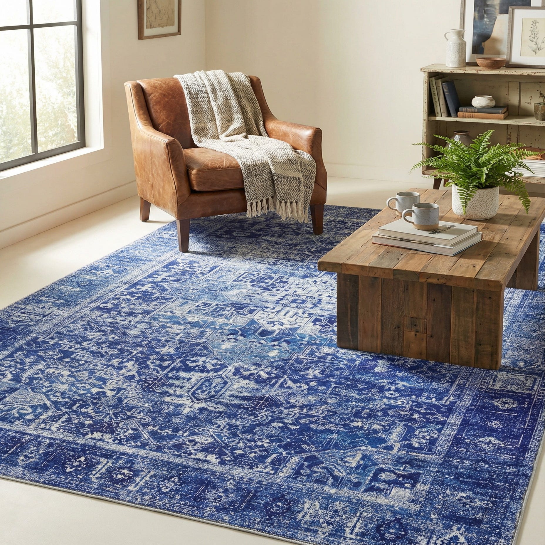 Primary color is Navy Blue. Colors in this rug include: Navy Blue, Ivory.