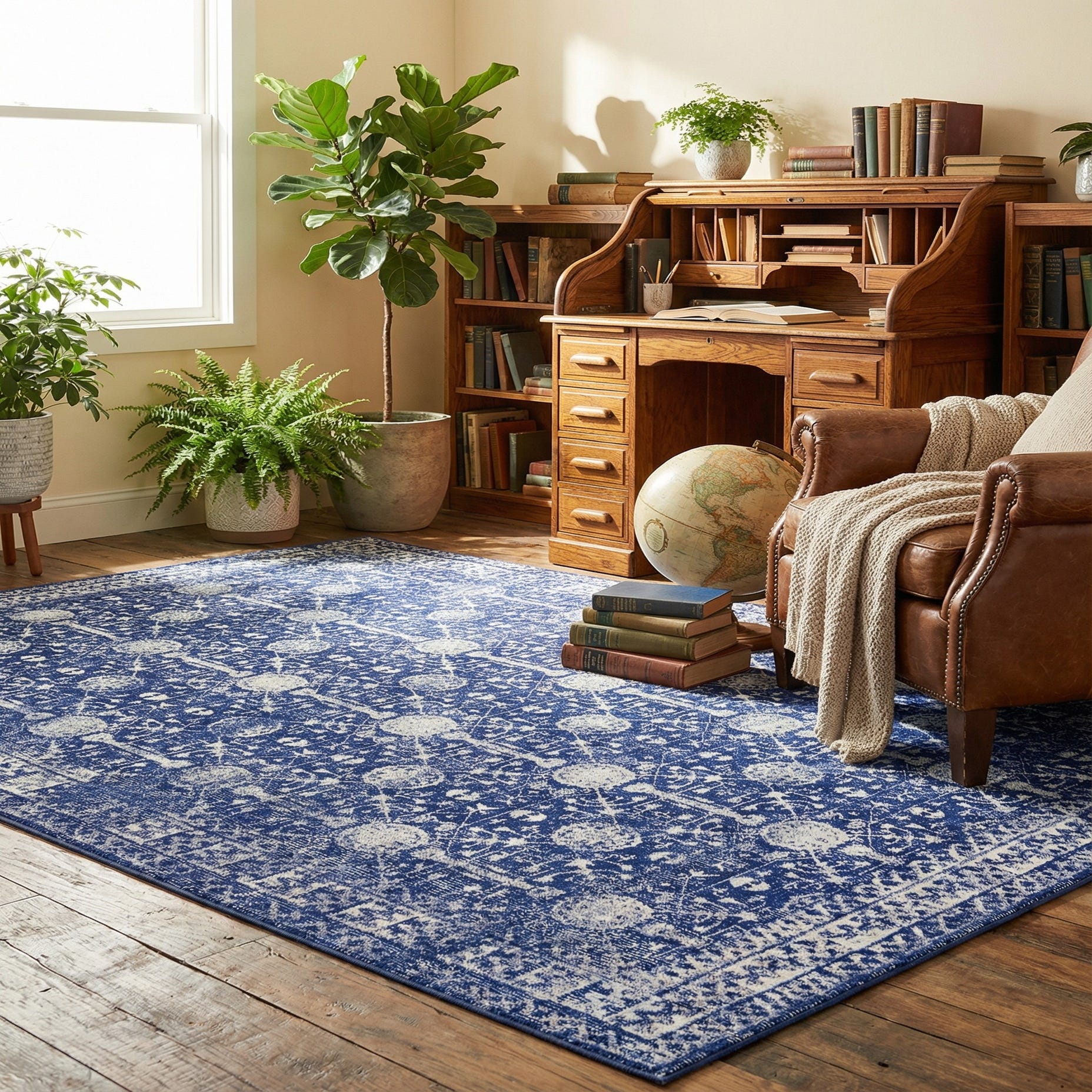 Primary color is Navy Blue. Colors in this rug include: Navy Blue, Ivory.