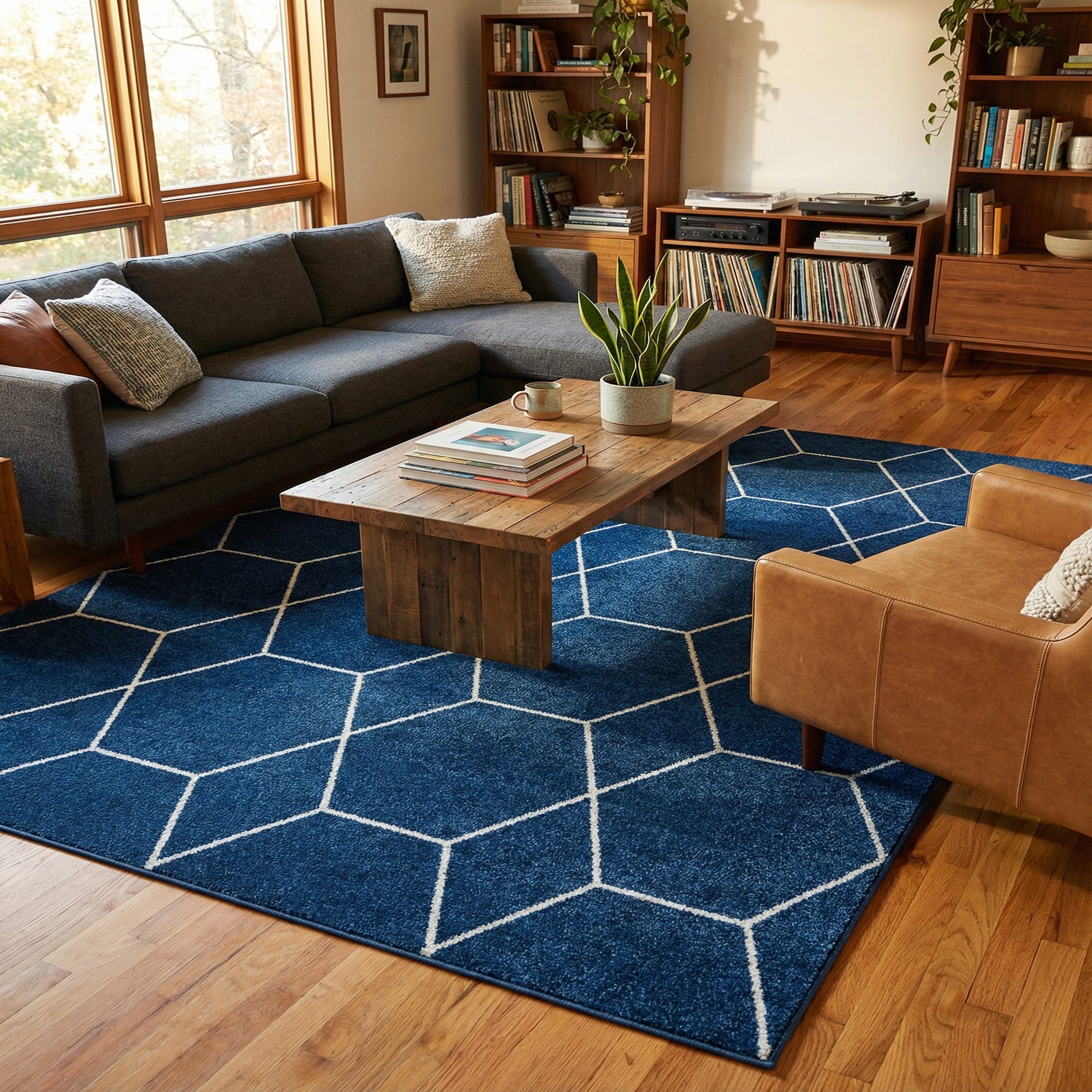 Primary color is Navy Blue. Colors in this rug include: Navy Blue, Ivory.