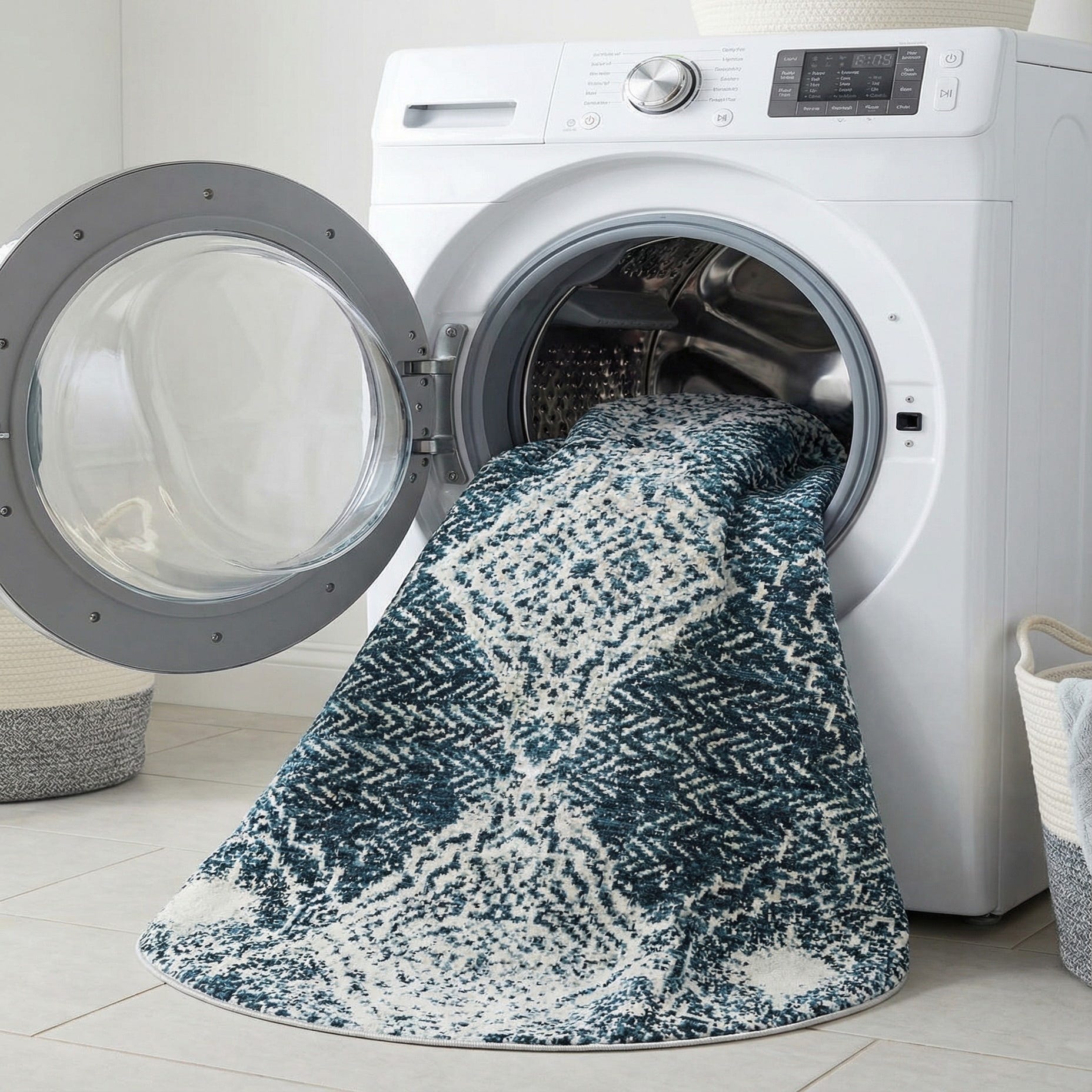 Primary color is Navy Blue. Colors in this rug include: Navy Blue, Light Blue.