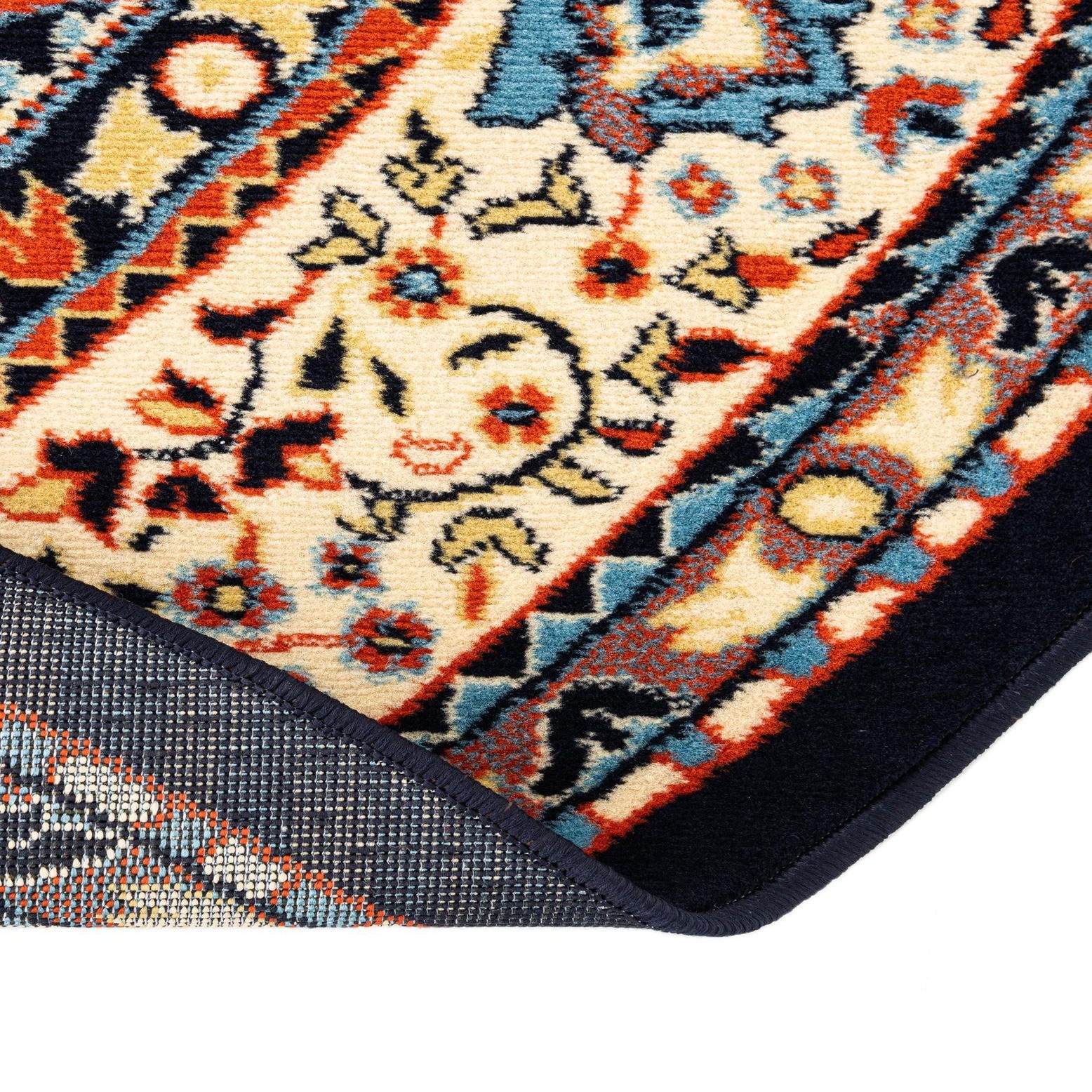 Primary color is Navy Blue. Colors in this rug include: Navy Blue, Cream, Light Blue, Terracotta.