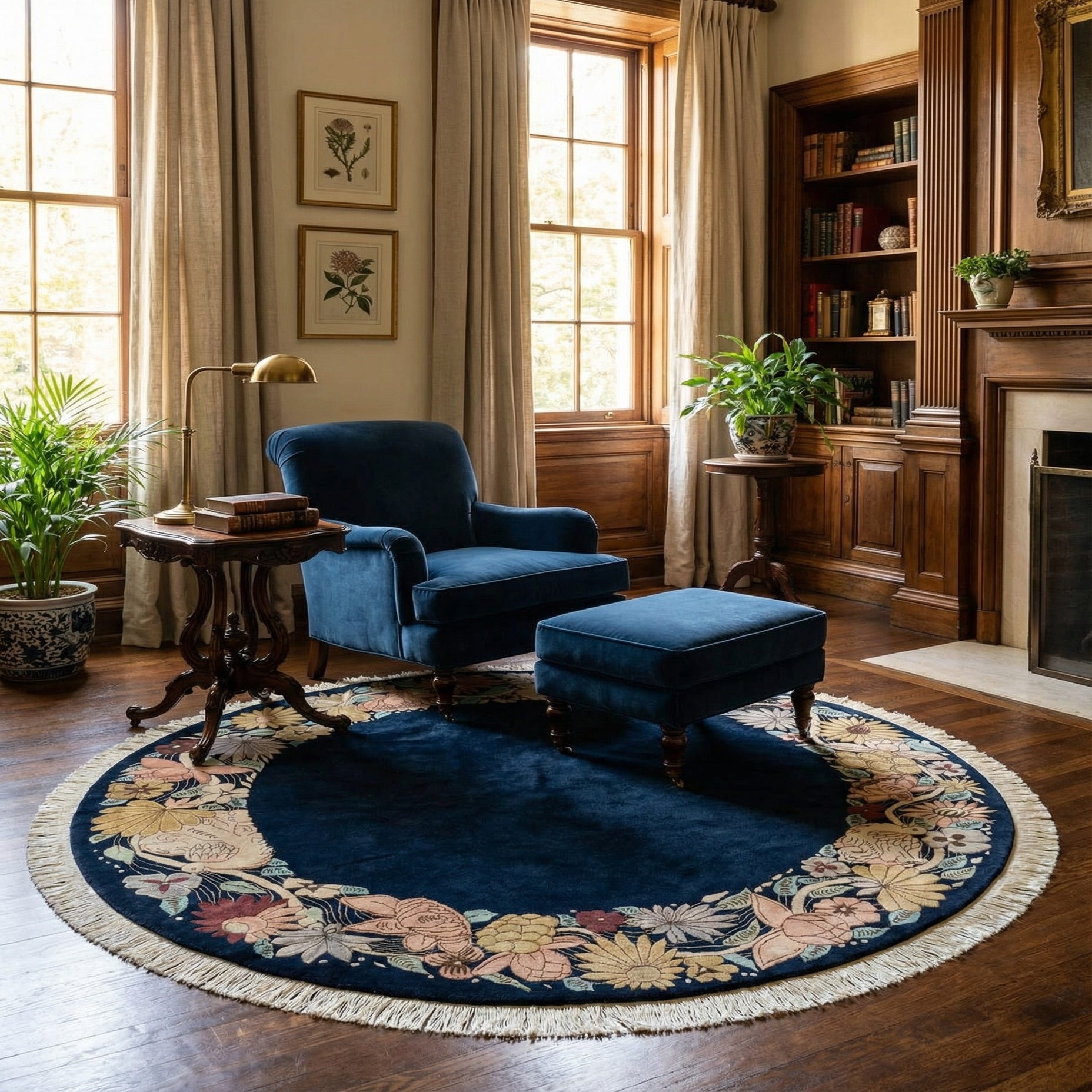 Primary color is Navy Blue. Colors in this rug include: Navy Blue, Beige, Brown, Burgundy, Light Green, Peach, Yellow, Gray, Light Blue.