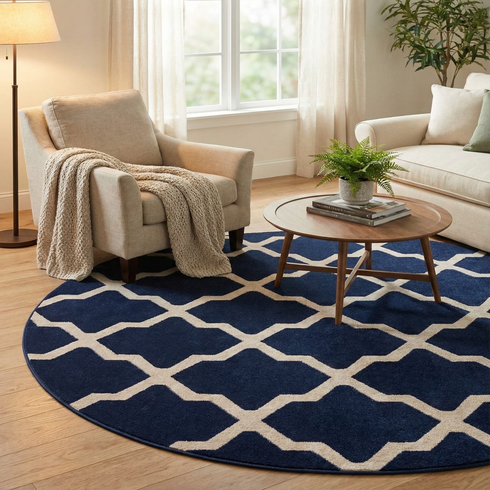 Primary color is Navy Blue. Colors in this rug include: Navy Blue, Beige.