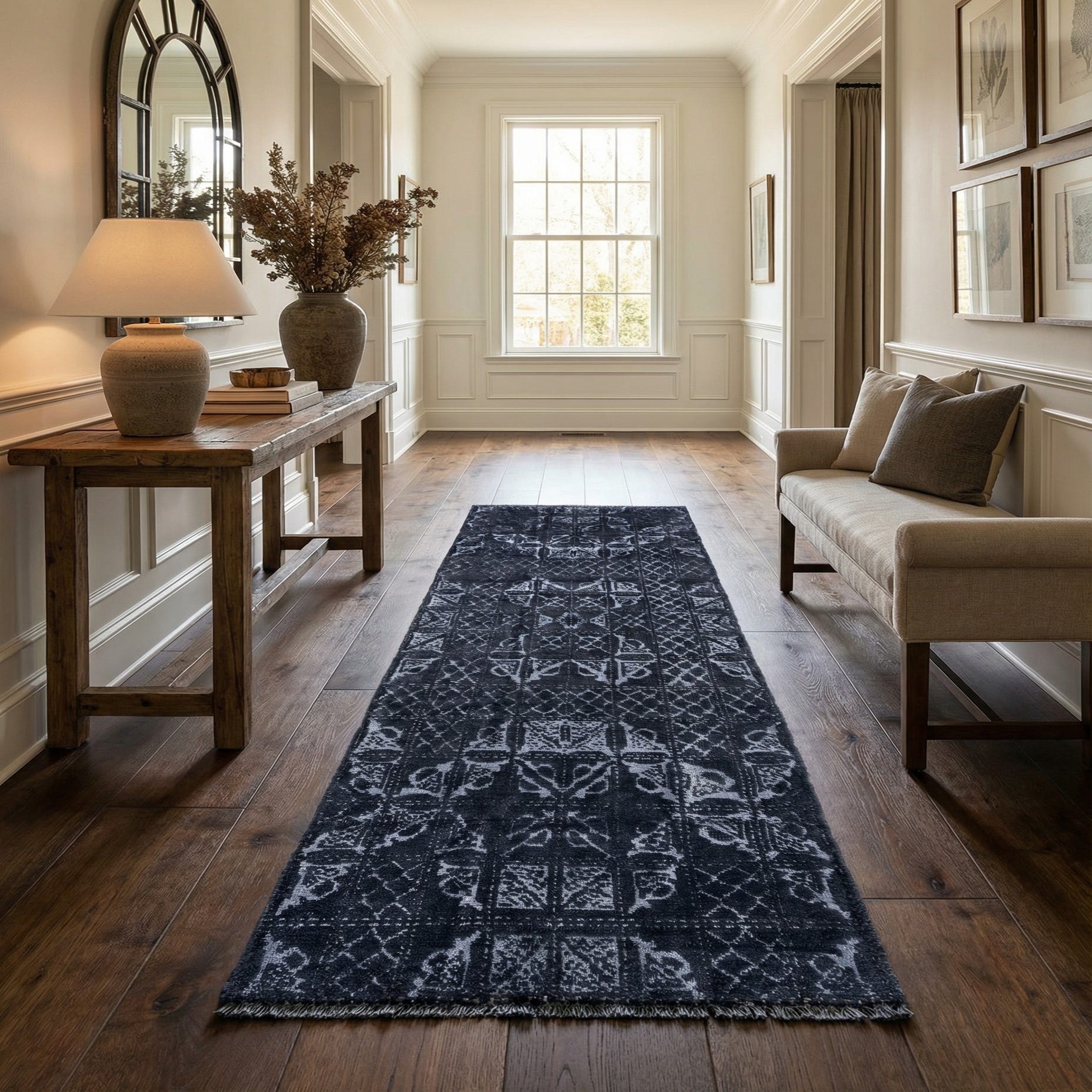 Primary color is Navy Blue. Colors in this rug include: Navy Blue, Ivory.