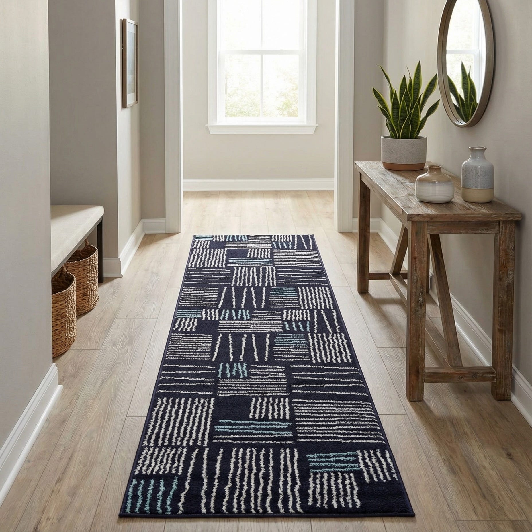Primary color is Navy Blue. Colors in this rug include: Navy Blue, Ivory, Light Blue.
