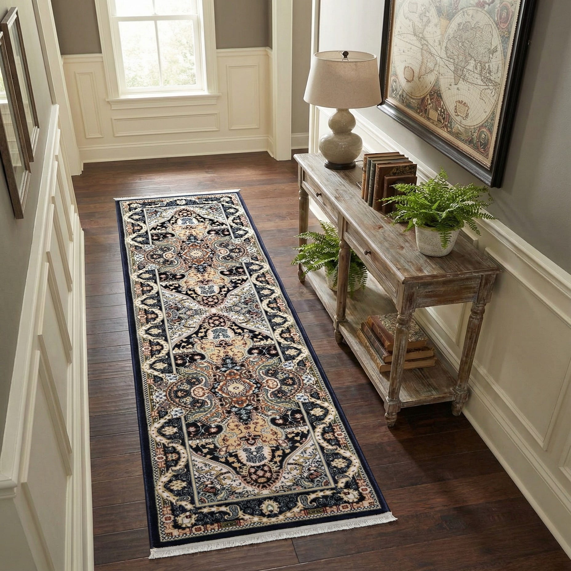 Primary color is Navy Blue. Colors in this rug include: Navy Blue, Blue, Burgundy, Cream, Green, Ivory, Plum Red, Tan.