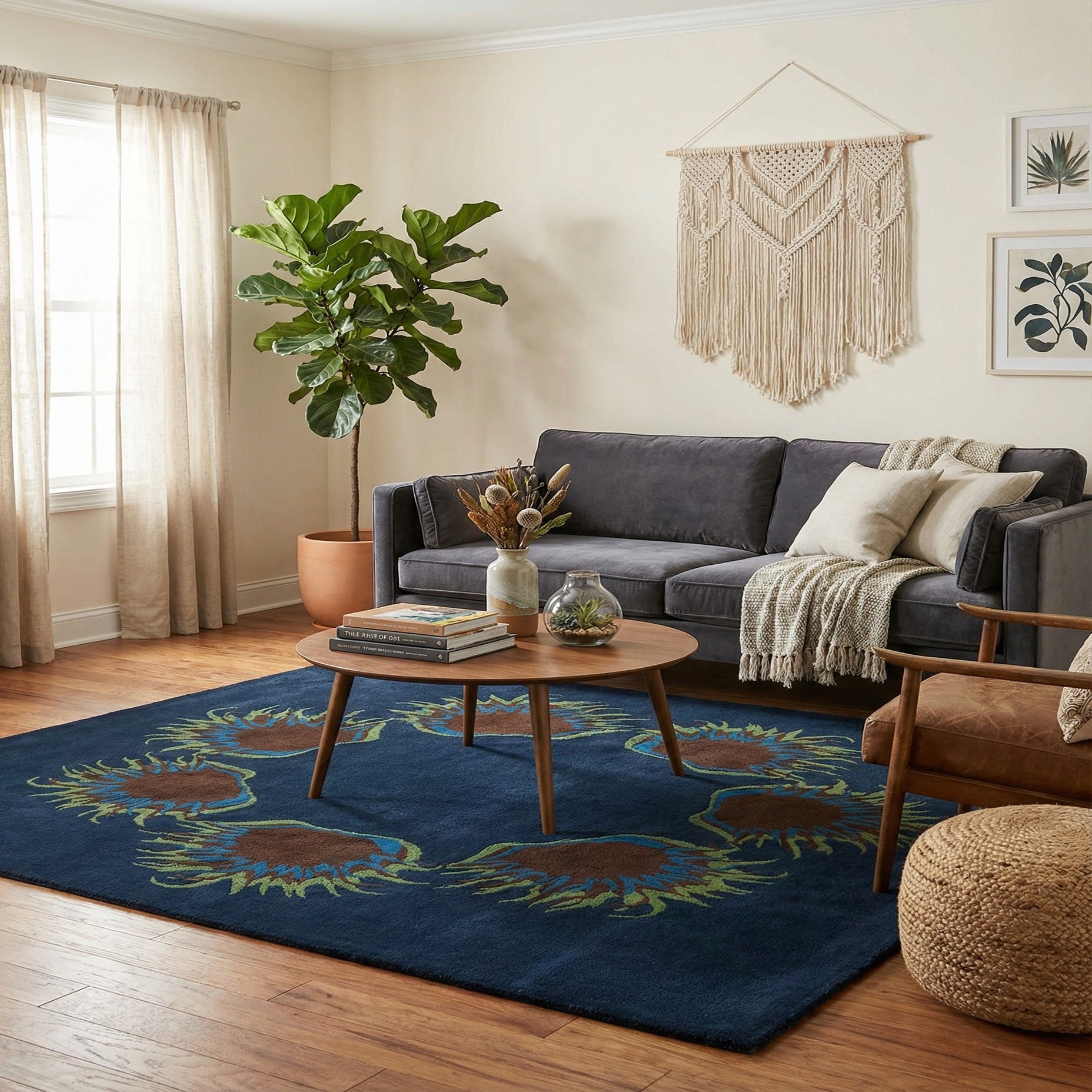 Primary color is Navy Blue. Colors in this rug include: Navy Blue, Blue, Brown, Green.