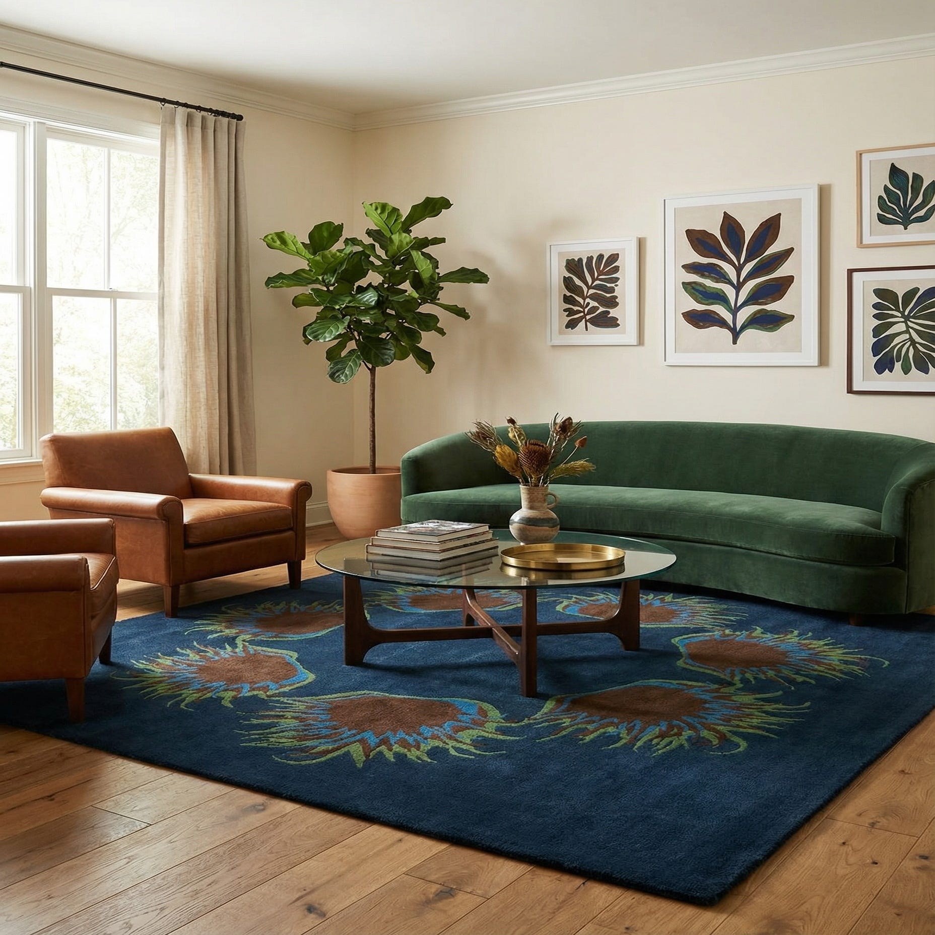 Primary color is Navy Blue. Colors in this rug include: Navy Blue, Blue, Brown, Green.