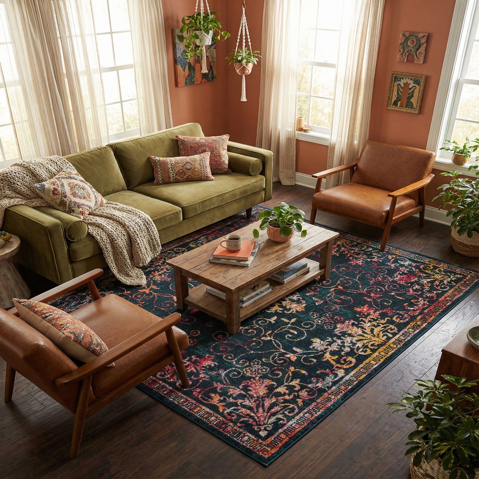 Primary color is Navy Blue. Colors in this rug include: Navy Blue, Gray, Ivory, Red, Yellow, Pink, Orange.