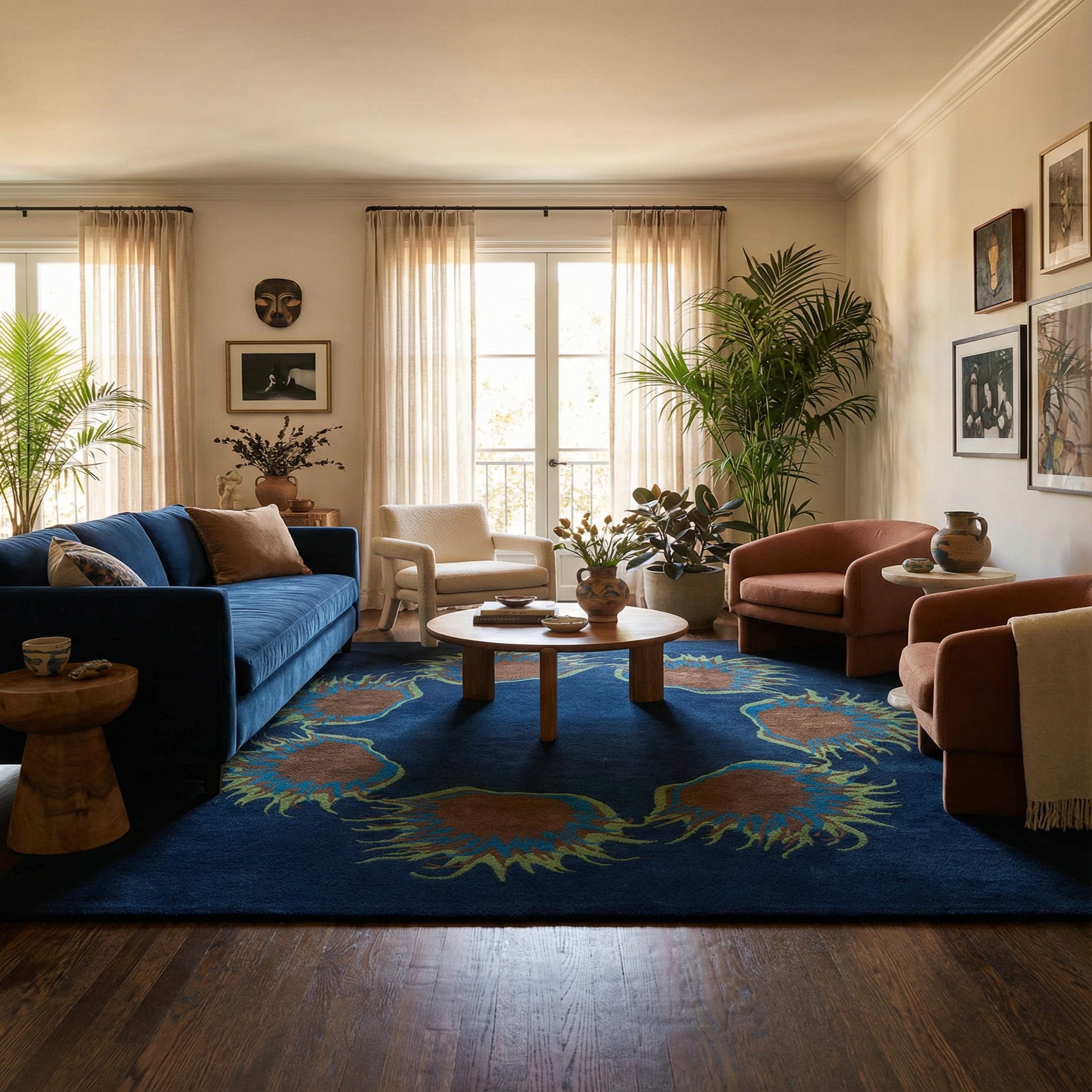 Primary color is Navy Blue. Colors in this rug include: Navy Blue, Blue, Brown, Green.