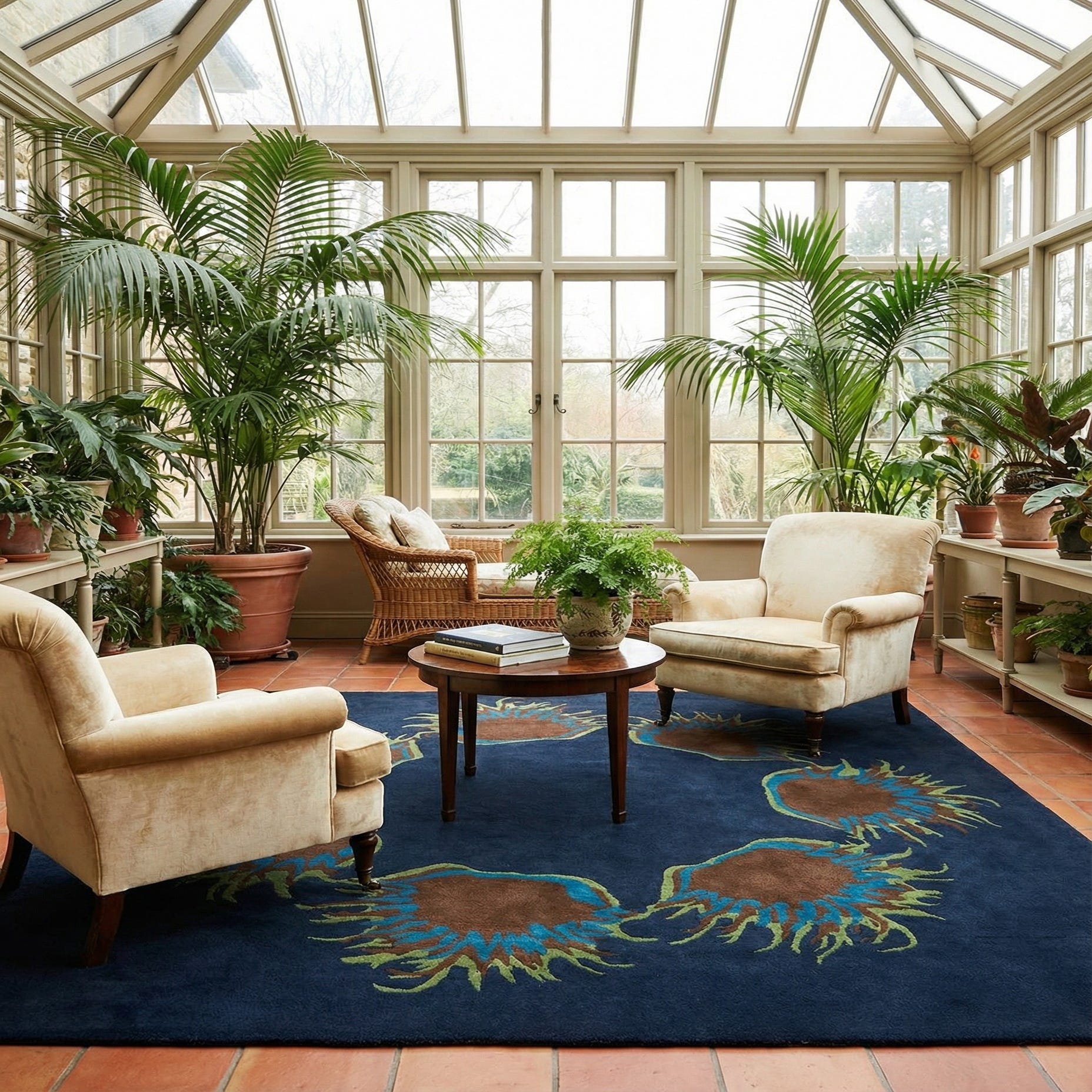 Primary color is Navy Blue. Colors in this rug include: Navy Blue, Blue, Brown, Green.