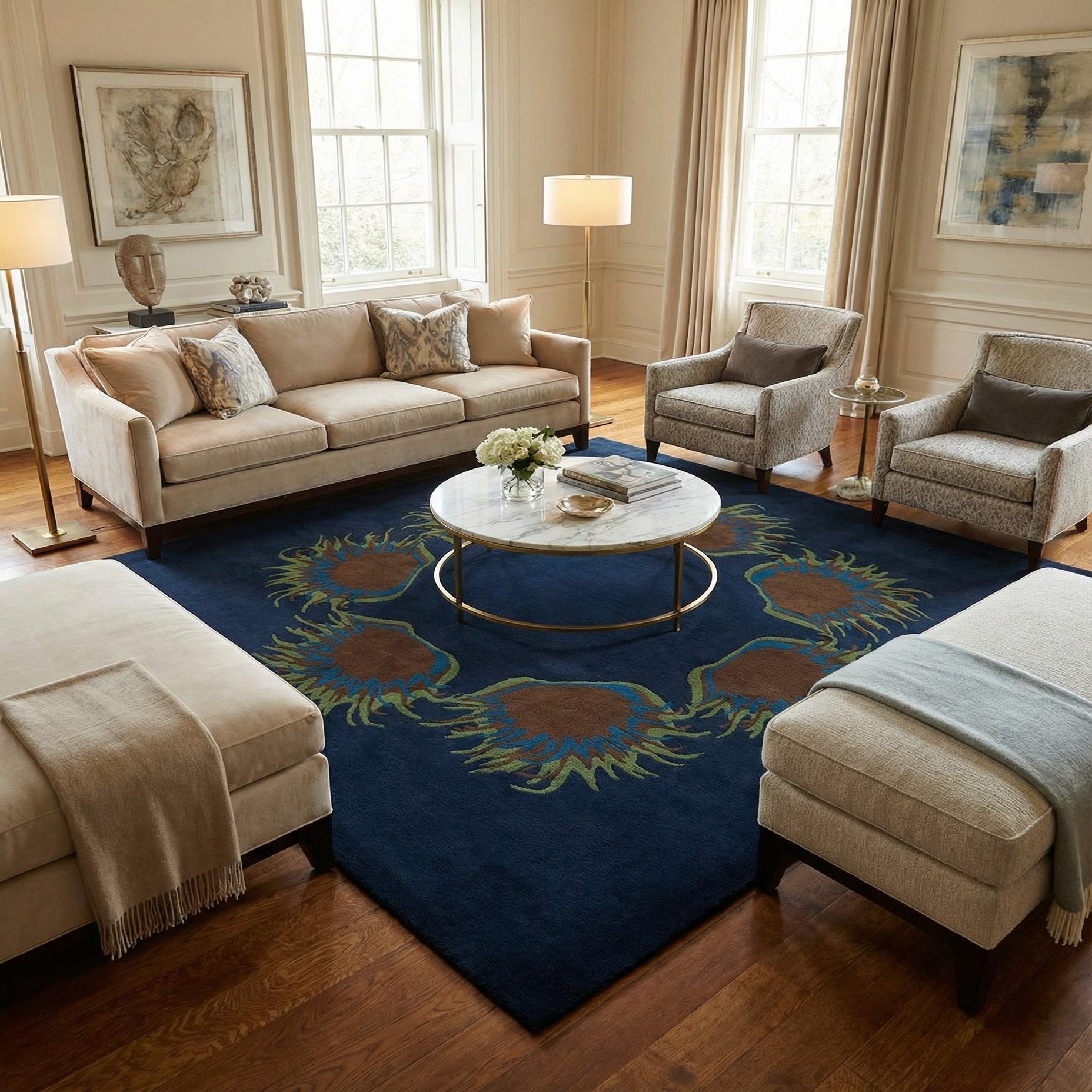 Primary color is Navy Blue. Colors in this rug include: Navy Blue, Blue, Brown, Green.