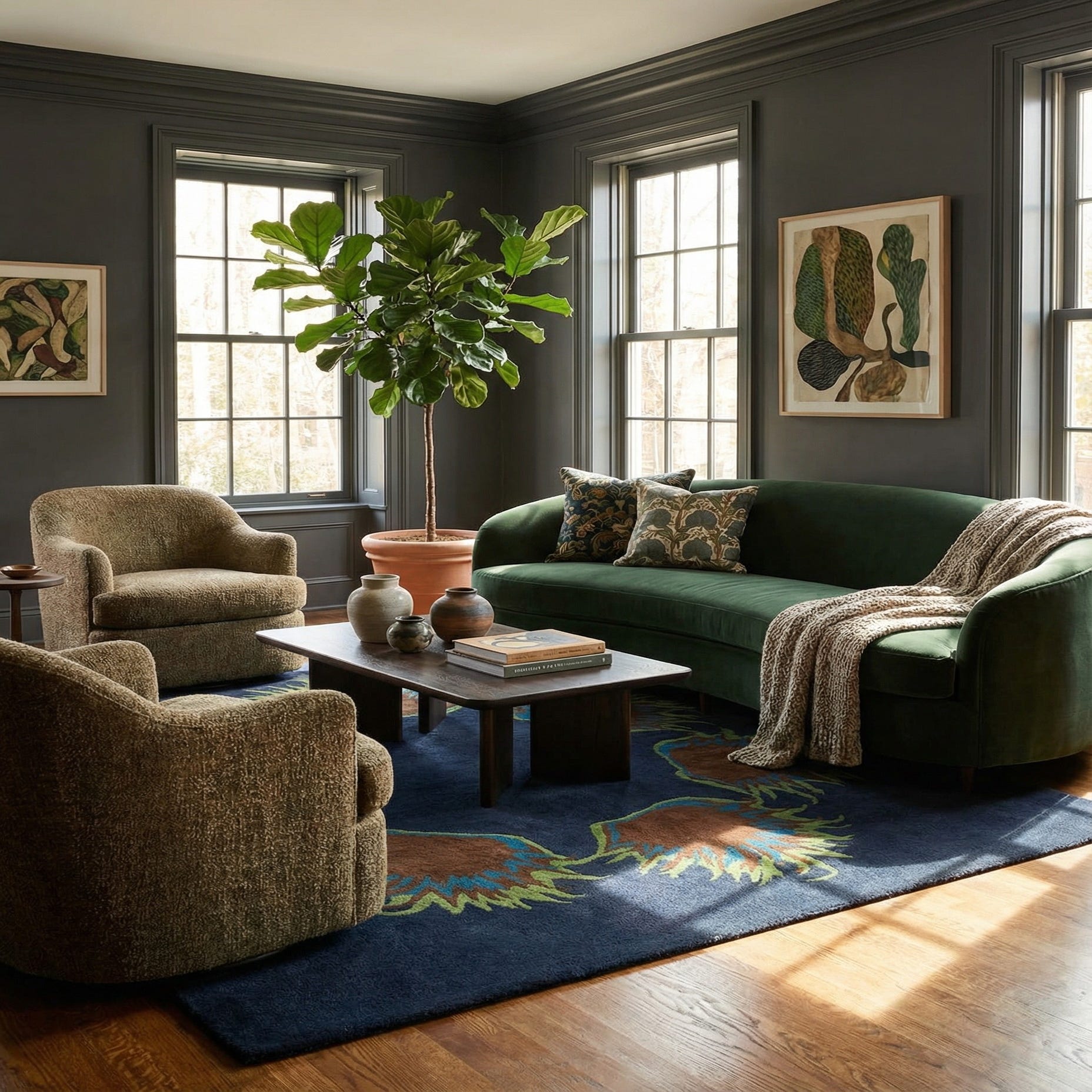 Primary color is Navy Blue. Colors in this rug include: Navy Blue, Blue, Brown, Green.