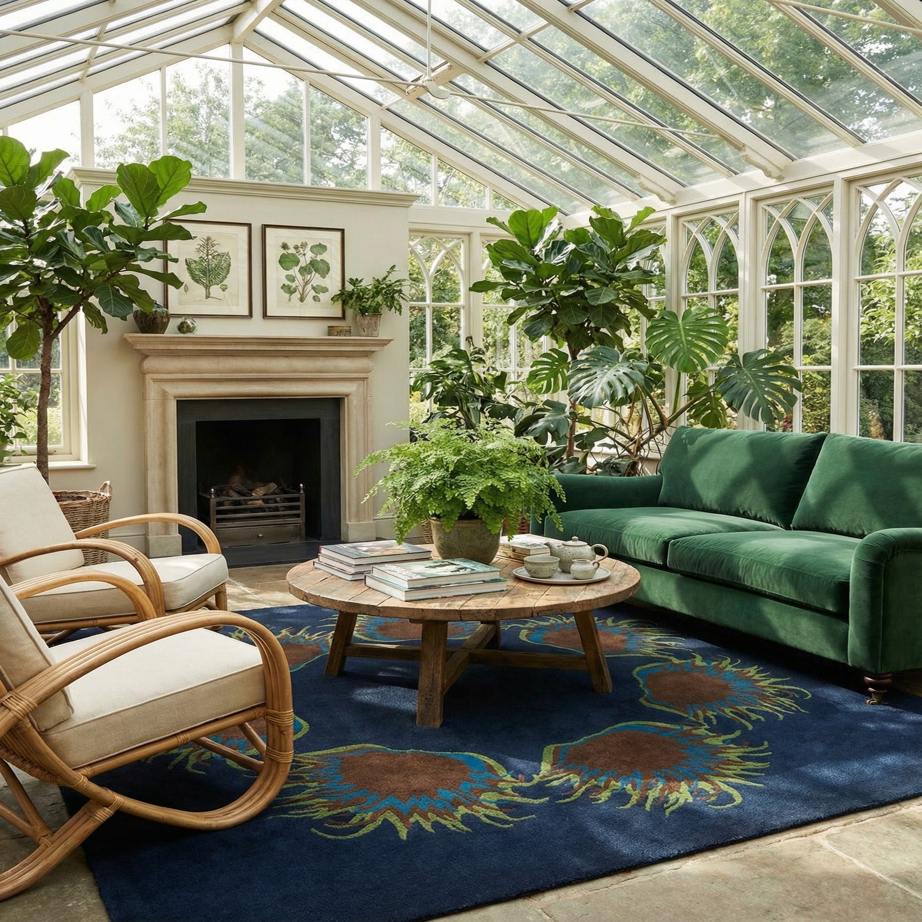 Primary color is Navy Blue. Colors in this rug include: Navy Blue, Blue, Brown, Green.