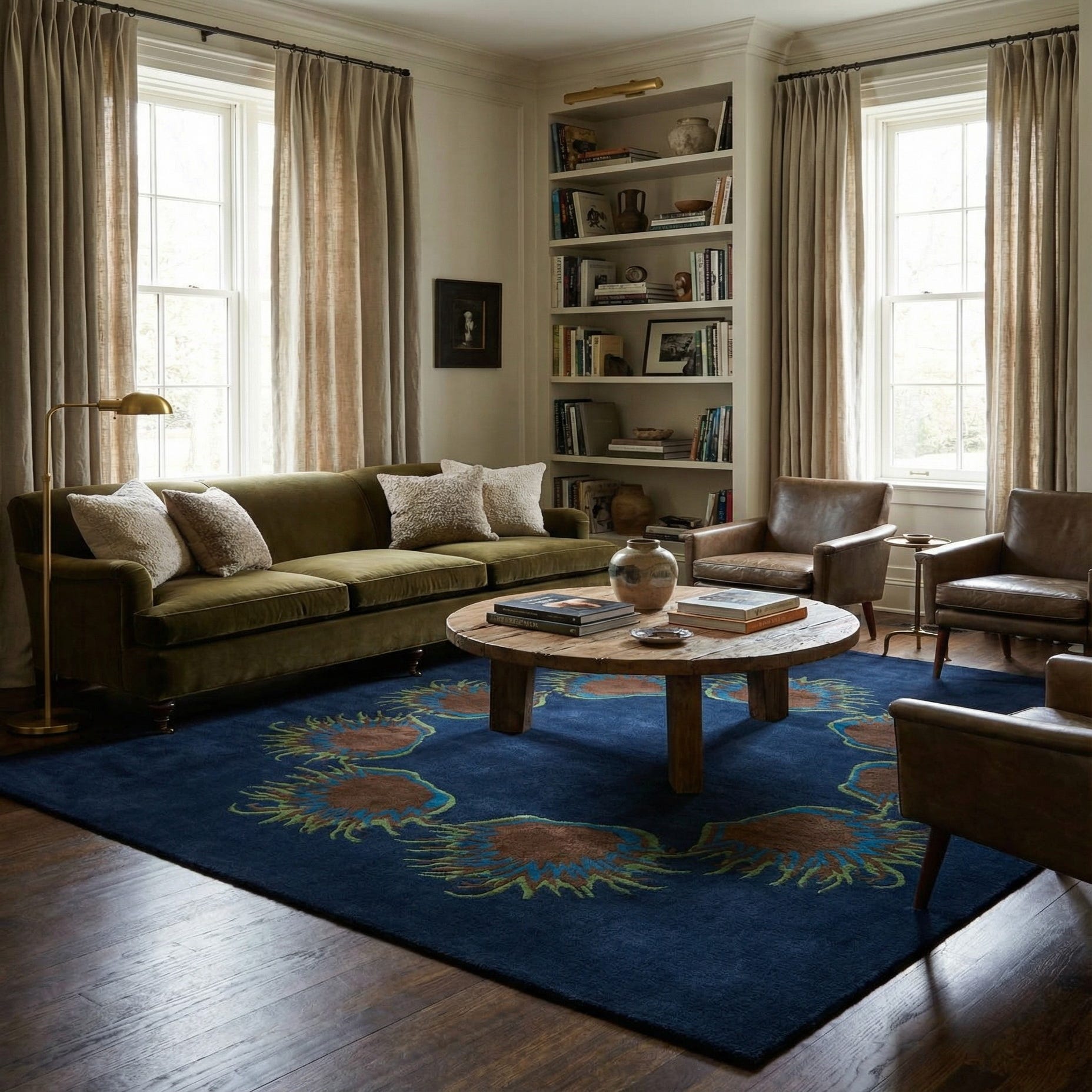 Primary color is Navy Blue. Colors in this rug include: Navy Blue, Blue, Brown, Green.